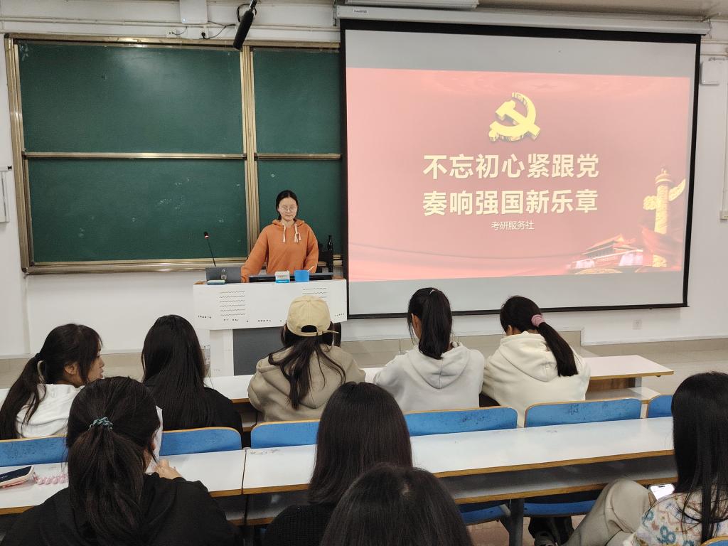 为传承红色基因和加强思想政治引领,11月10日晚,考研服务社于社科楼514开展了“怀揣初心紧跟党,奏响强国新乐章”主题团课活动。本次活动社团全体成员参加,社长丁文倩、团支书冀艺婷共同主持。