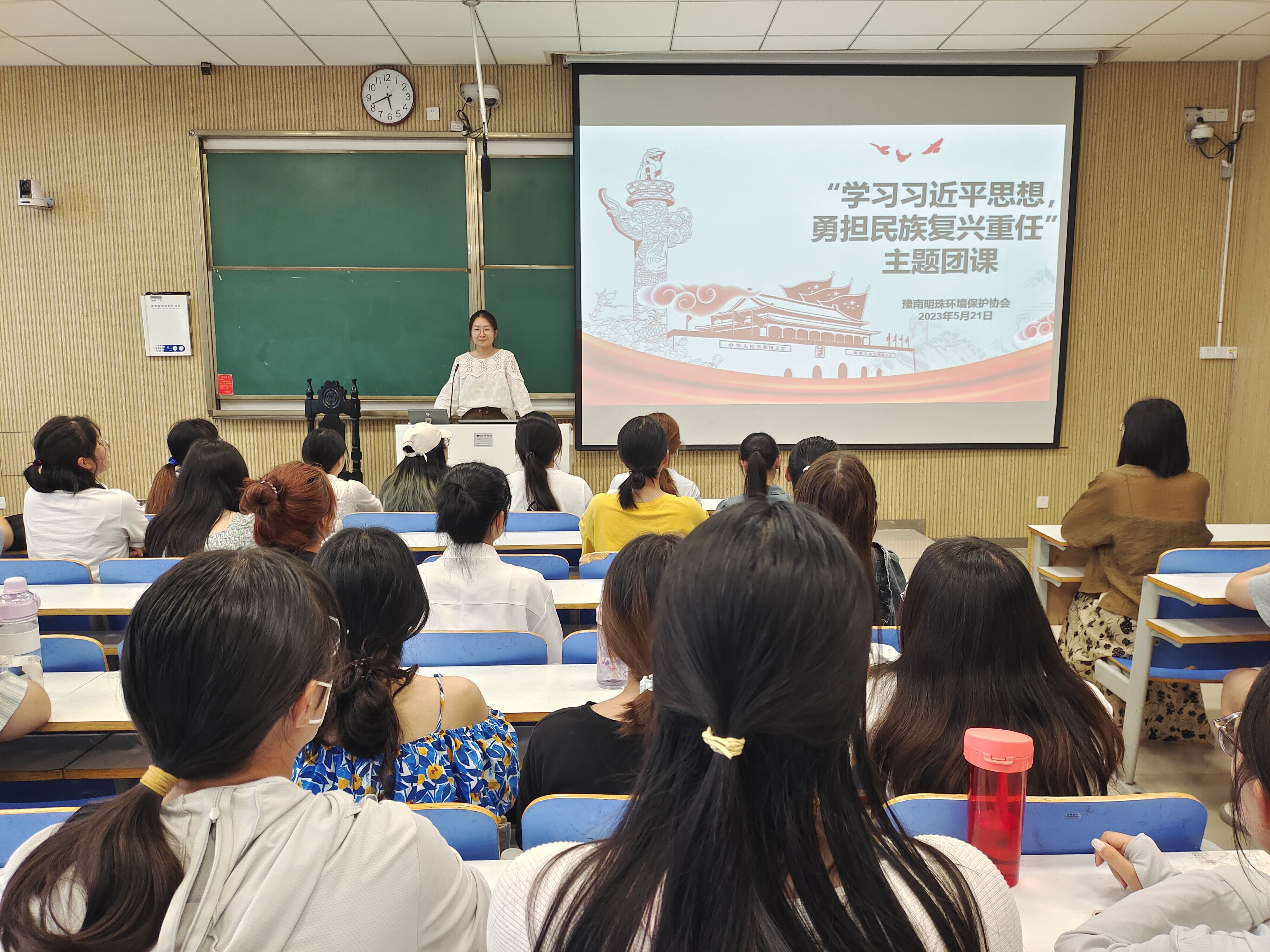 习近平新时代中国特色社会主义思想产生于新时代,对新时代国内、国际面临的重大问题作出了科学回答,具有引领时代的作用。为深入践行习近平总书记在中国人民大学考察调研时期的讲话精神,将习近平新时代中国特色社会主义思想融入青年日常生活行为中,5月21日,豫南明珠环境保护协会于社科楼515教室举办“学习习近平新时代中国特色社会主义思想,勇担民族复兴重任”主题团课。