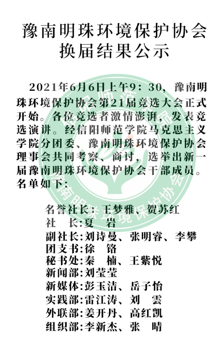 6月6日上午,豫南明珠环境保护协会换届竞选大会在社科楼514顺利举行。永利集团官网分团委社团分管主席、社团会长、团支书、各部部长及20级社团成员共同参加了此次会议。会议由会长王梦雅主持。