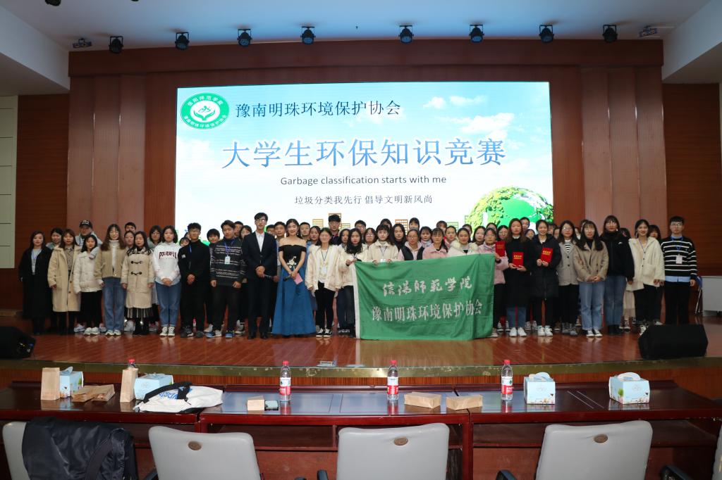 为响应习近平总书记对于垃圾分类工作的重要指示,呼吁更多学生关注和参与生态环境保护,12月7日晚,由信阳师范学院后勤管理处、永利集团官网分团委主办,豫南明珠环境保护协会承办的以“垃圾分类我先行,倡导文明新风尚”为主题的大学生环保知识竞赛决赛于逸夫楼报告厅成功举行。信阳师范学院后勤管理处龚关老师,永利集团官网豫南明珠环境保护协会指导老师胡春湘、永利集团官网学生会主席团、各兄弟社团以及400余名学生共同参与本次活动。比赛由王誉博和赵万里主持。