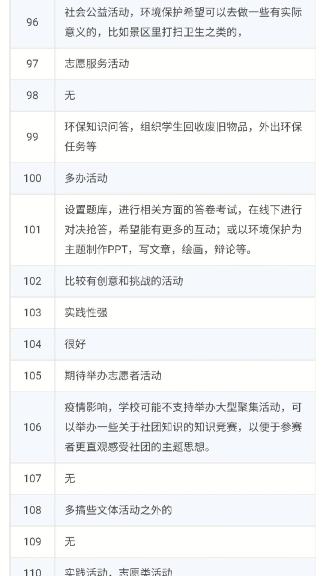 本次活动共分为填写网上调查问卷和提交活动策划两部分内容。首先,为了解学生对社团的认识,发现社团存在的问题,进一步完善社团的建设,提高社团的服务能力和整体水平,社团选择采取发放调查问卷的方式来知晓社团发展情况,要求参与者真实填写问卷并提交问卷截图以此作为参加活动的标志之一。接着,参与者明确策划要求后,立即展开活动策划的准备活动,以自身所有的环保知识为依据,多方收集资料,构思活动框架,确定活动主题和内容,发挥自己的创新思维,从活动目的、活动准备、活动流程、活动意义等部分入手,以组织者的视角进行策划的撰写,涌现出众多创意新颖、内容完整、切实可行的优秀作品。最后,经参赛人员投票选出优秀作品并公示。