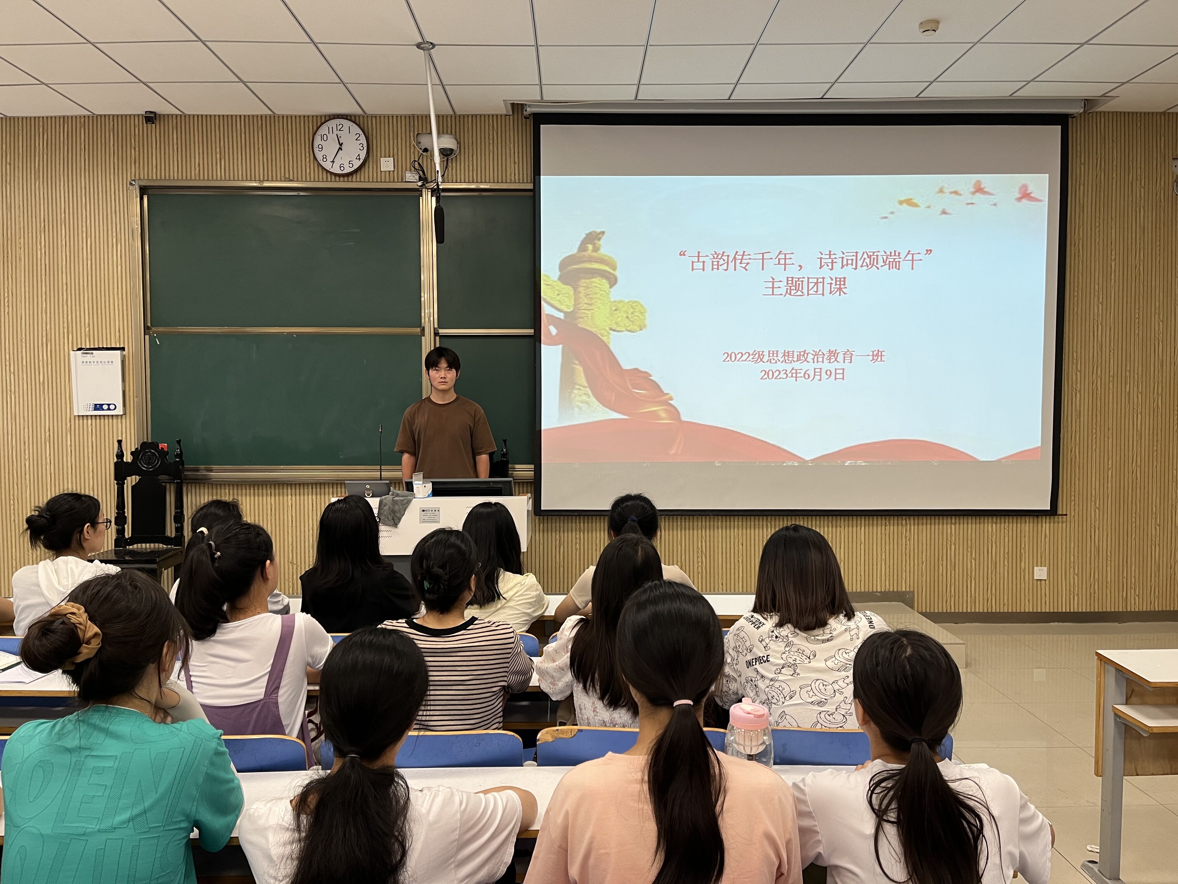 为进一步弘扬中华民族优秀传统文化,发挥传统节日在加强思想建设中的作用,6月9日上午,永利集团官网2022级思想政治教育一班在社科楼515教室召开“古韵传千年,诗词颂端午”主题团课,2022级思想政治教育一班全体同学共同参与本次团课,团课由团支部副书记闻炎仲主持。