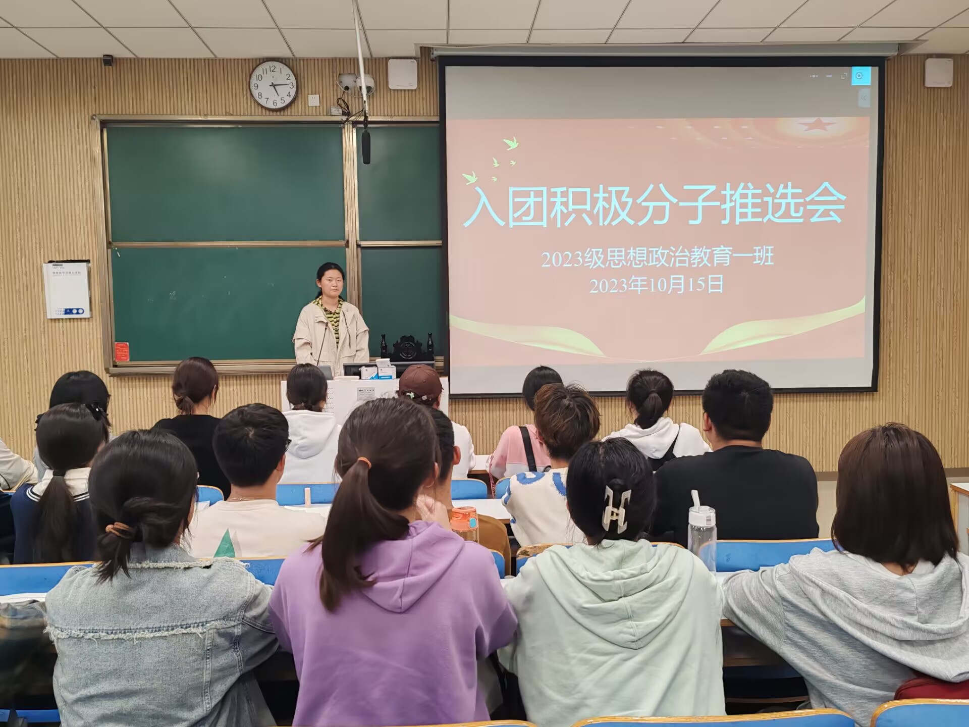 为进一步加强团组织建设,增强团支部的凝聚力,积极开展团青工作,10月15日下午,永利集团官网2023级思想政治教育一班在社科楼514教室召开入团积极分子推选班会。永利集团官网2023级思想政治教育一班全体同学共同参与本次班会,班会由团支书张卓主持。
