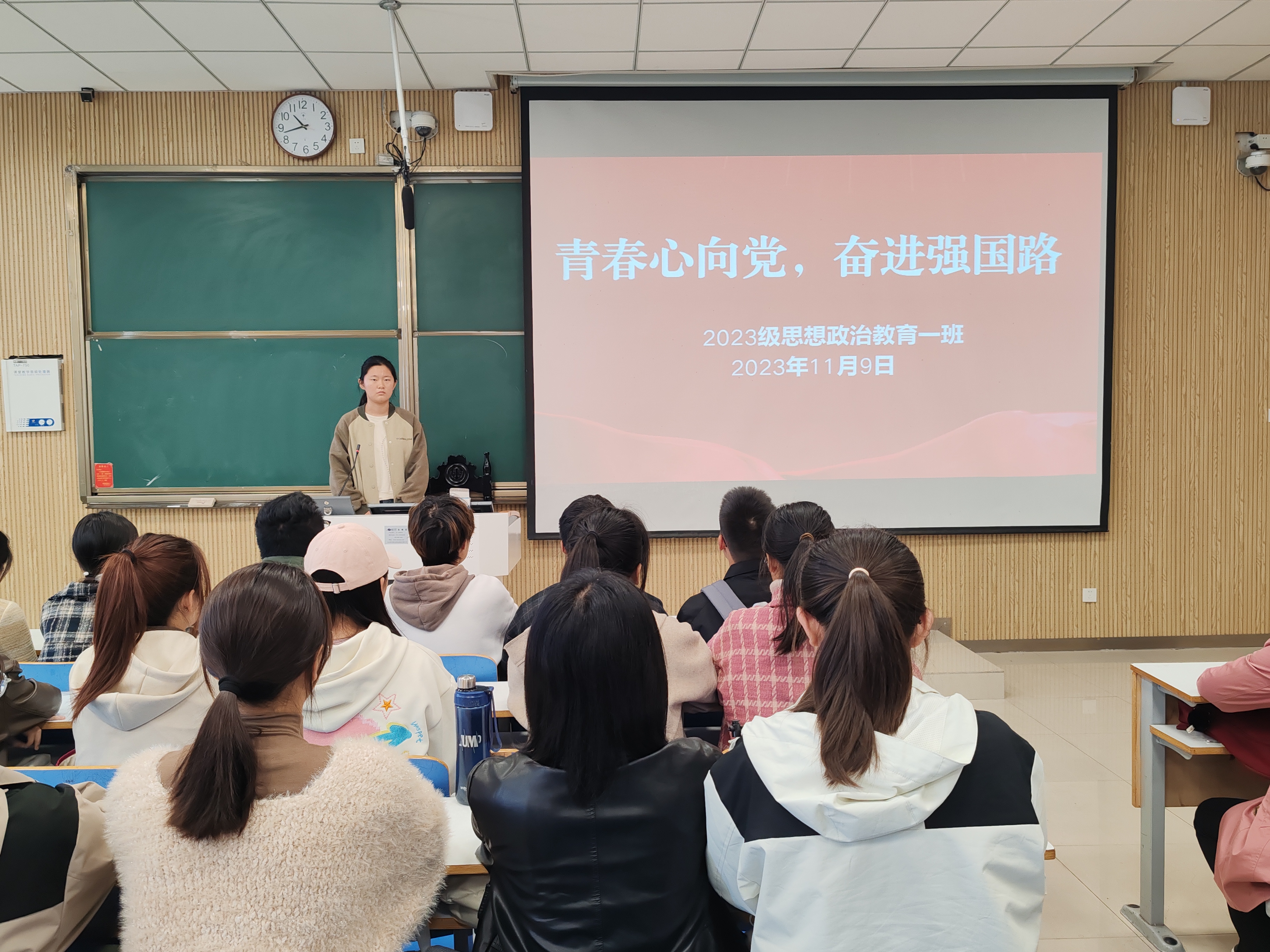 为进一步引导我班学子树立共产主义远大理想,坚定中国特色社会主义共同理想,坚定听党话、跟党走的政治信念,11月8日上午,永利集团官网2023级思想政治教育一班在社科楼515教室召开“青年心向党,奋进强国路”主题团课。永利集团官网2023级思想政治教育一班全体同学共同参与本次团课,团课由团支书张卓主持。