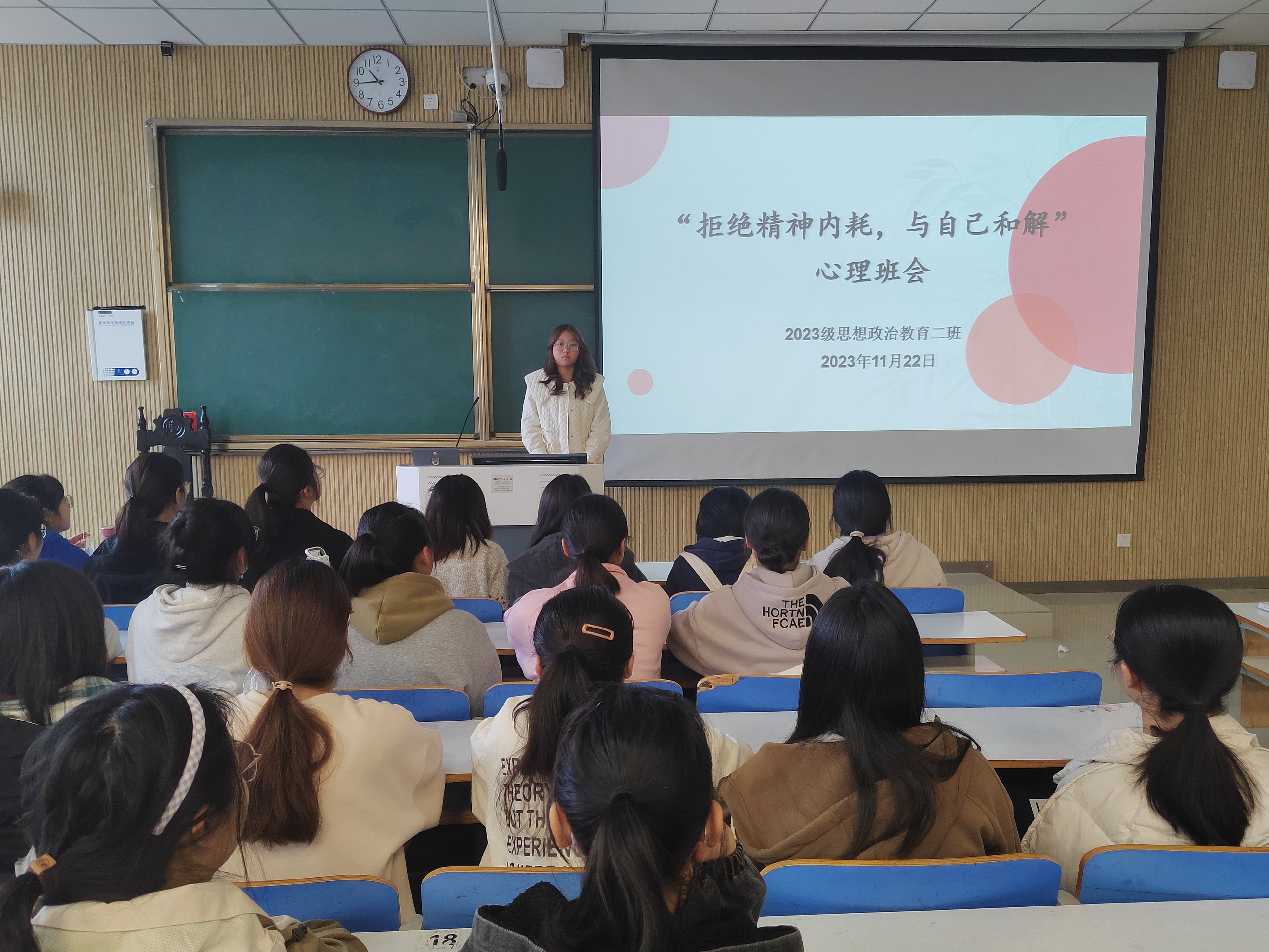 为促进学生心理健康,建立良好的班级氛围,11月22日下午,永利集团官网2023级思想政治教育二班在社科楼515教室召开“拒绝精神内耗,与自己和解”心理班会。本次心理班会由心理委员李羽欣主持,二班全体同学共同参加。