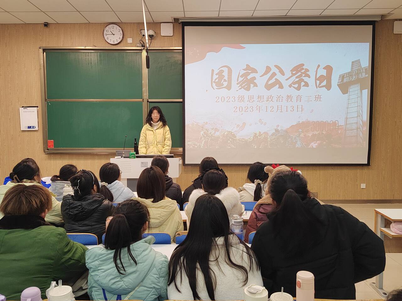 为使同学们铭记历史,激发爱国热情,传递和平之声,12月13日,永利集团官网2023级思想政治教育二班在社科楼515教室召开“缅怀先灵,勿忘国耻”主题团课。本次团课由团支书王慜初主持,全体二班同学共同参加。