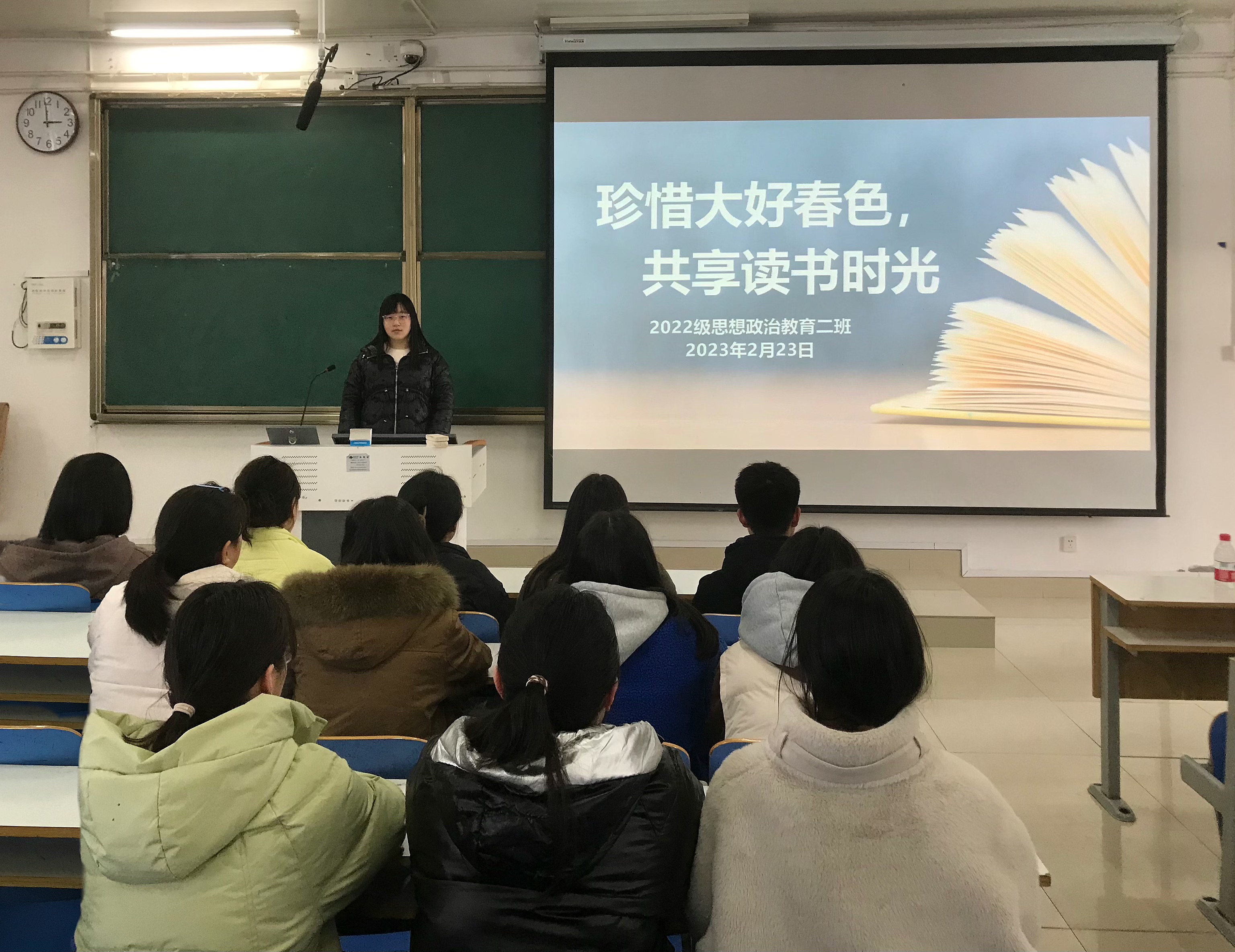 春光明媚好读书,墨韵飘香沁心扉。2月23日下午,永利集团官网2022级思想政治教育二班在社科楼514教室召开“珍惜大好春色,共享读书时光”主题班会。2022级思想政治教育二班全体同学共同参加会议。班会由班长李佳音主持。