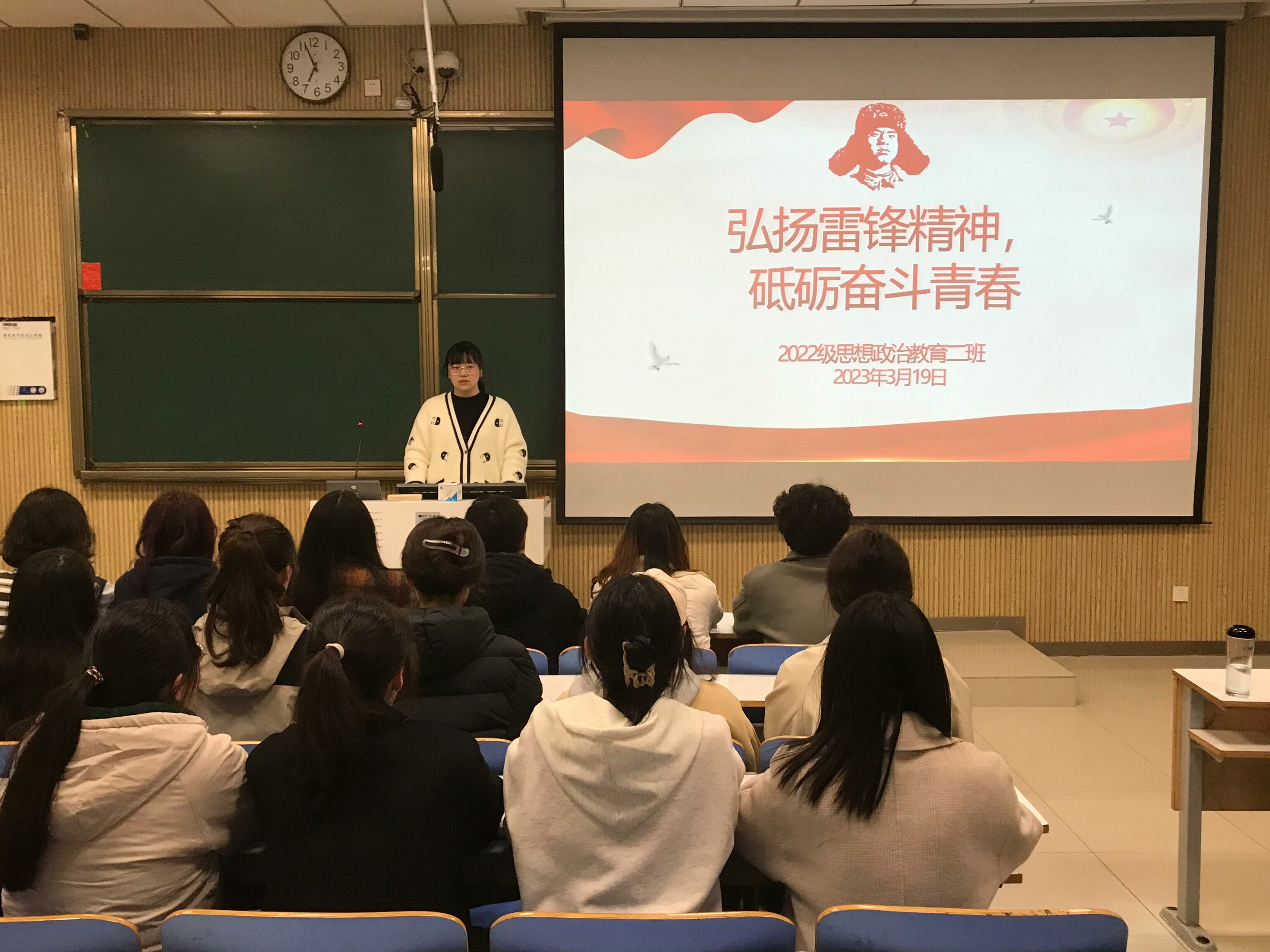 3月19日下午,永利集团官网2022级思想政治教育二班在社科楼515教室召开“弘扬雷锋精神,砥砺奋斗青春”主题团课,2022级思想政治教育二班全体同学共同参加。团课由团支书李佳音主持。