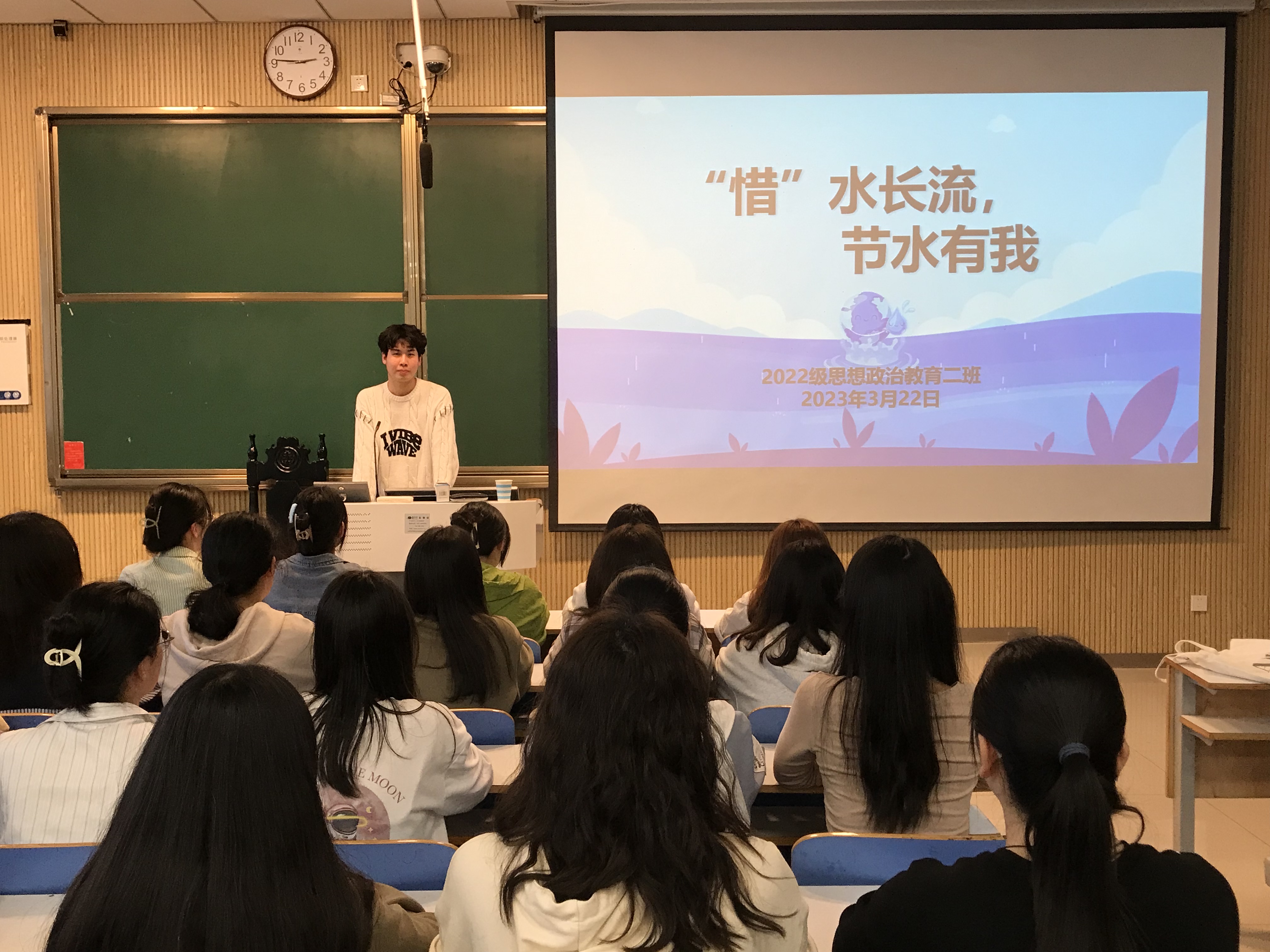 会议伊始,柴智森通过PPT与视频相结合的方式,向同学们介绍了世界水日的历史背景、标志及意义。随后,各小组在组长带领下就“生活中如何节约用水”展开讨论,同学们细心观察生活中的点滴,提出各种节水措施,如“志愿参与节水活动,制止用水不良现象”、“按需取用饮用水,带走未尽瓶装水”等提议,让他们对节约用水有了进一步的认识。最后,柴智森强调,勤俭节约是中华民族的传统美德,作为思政专业的学子,我们更要提高自身素养,不仅要节约用水,还要珍惜其他资源,让节约成为一种自觉、成为一种习惯。