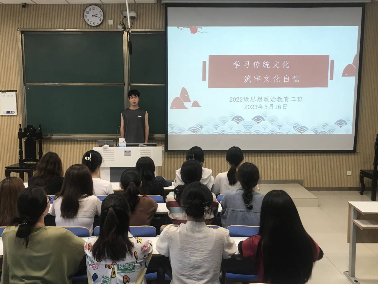 为深入贯彻落实党的二十大精神,进一步传承和弘扬中华优秀传统文化,5月16日下午,永利集团官网2022级思想政治教育二班在社科楼515教室召开“学习传统文化,筑牢文化自信”主题班会,2022级思想政治教育二班全体同学共同参加。班会由副班长柴智森主持。