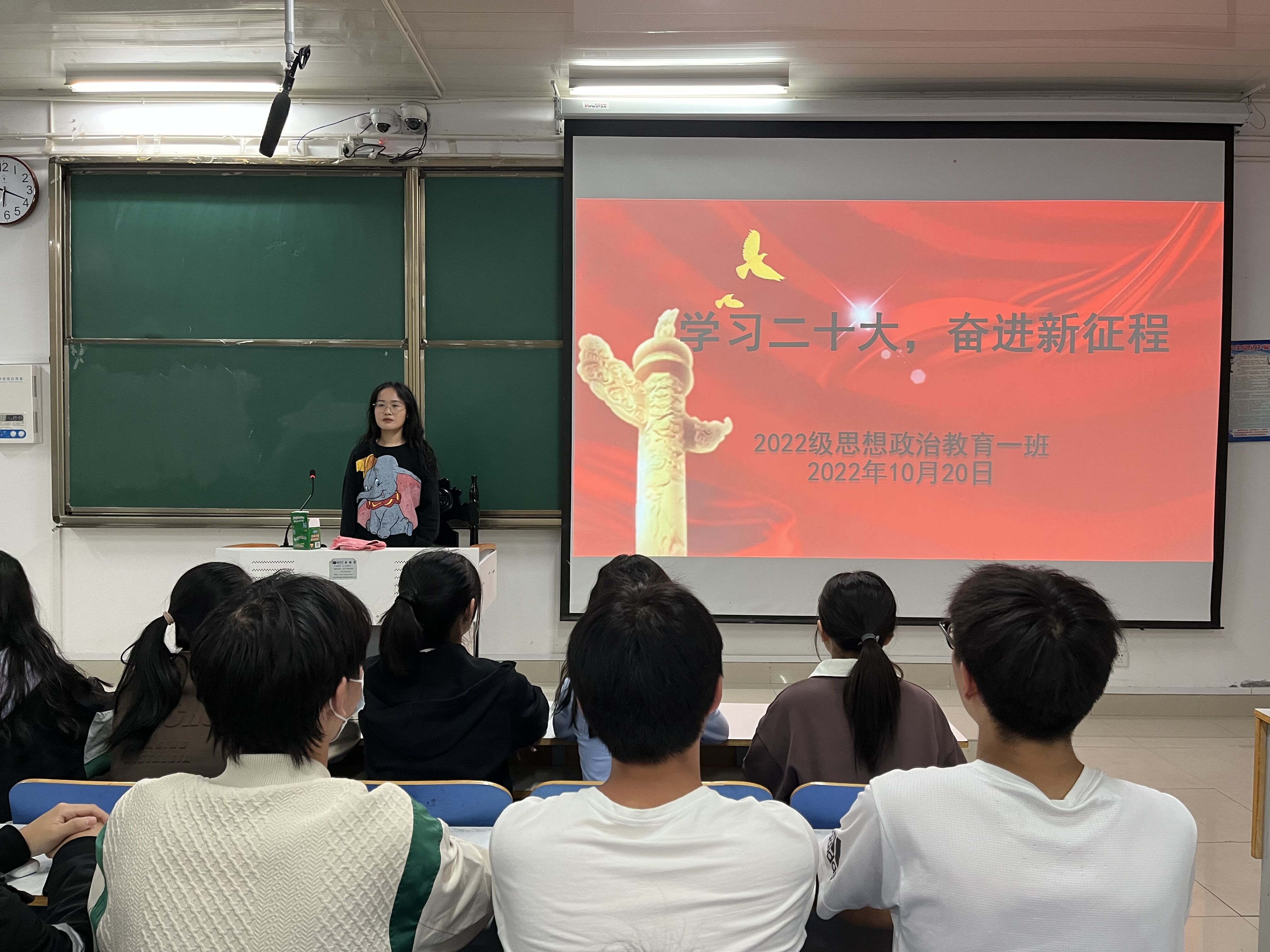 为教育引导同学们坚定理想信念,营造爱党爱国浓厚氛围,10月20日下午,永利集团官网2022级思想政治教育一班在社科楼514召开“学习二十大,奋进新征程”主题班会,2022级思想政治教育一班全体同学参与本次班会,班会由学习委员司露主持。
