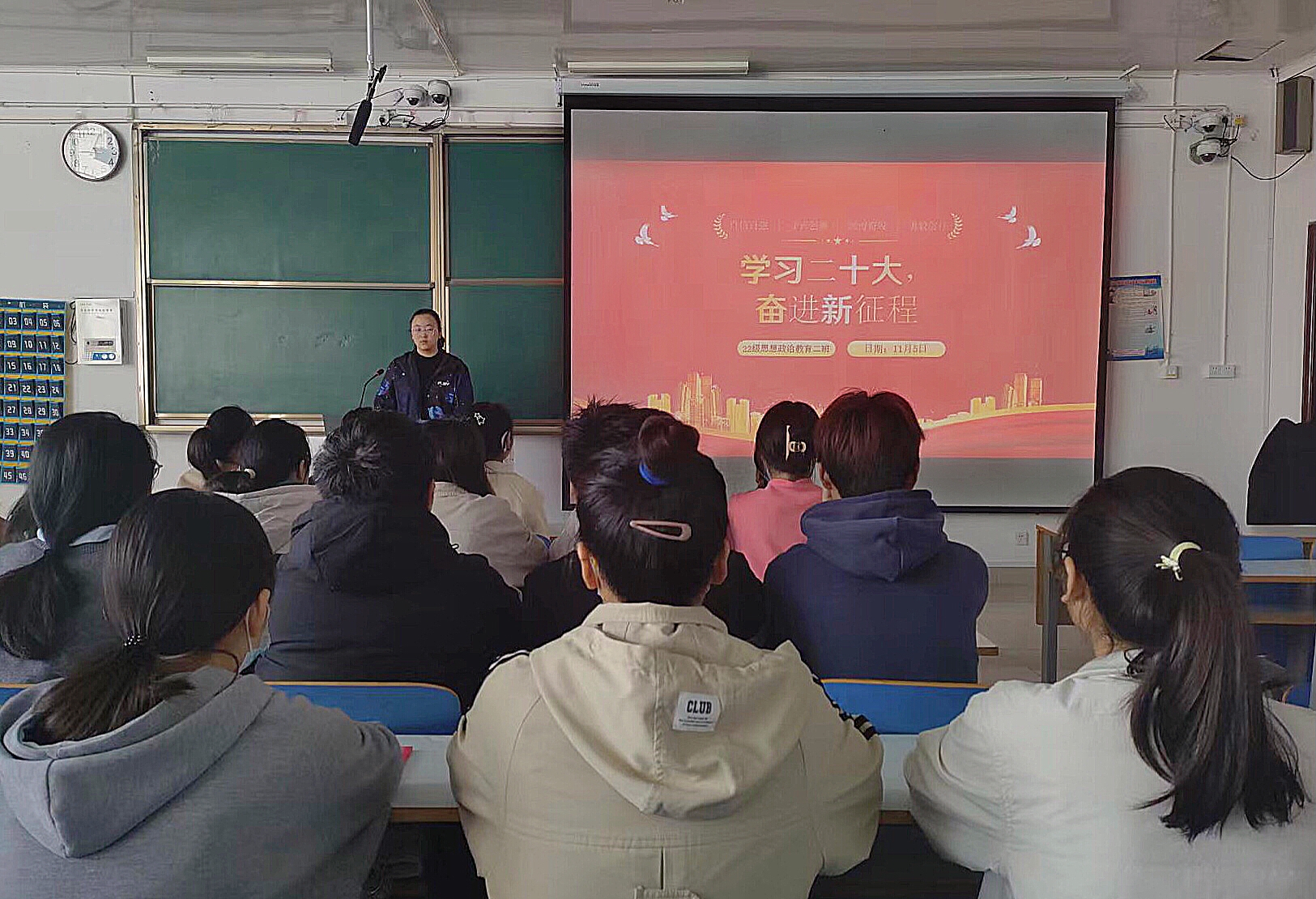 团课伊始,李佳音向同学们阐述了中国共产党第二十届全国代表大会的召开背景及时代意义,进而引出此次团课的主题与学习目标。随后,李佳音从十五条二十大报告的要点、三个务必、三件大事及三个始终等方面带领同学们学习二十大的重要内容,并和大家分享自己总结的二十大金句和热词。同学们专注听讲、用心感悟、认真记录,现场环节有序进行,令人印象深刻。最后,李佳音强调,大家要深入学习贯彻党的二十大精神,立志做有理想、敢担当、能吃苦、肯奋斗的新时代好青年,锐意进取、接续奋斗,把学到的本领奉献给祖国和人民,让青春之光闪耀在为梦想而奋斗的道路上。