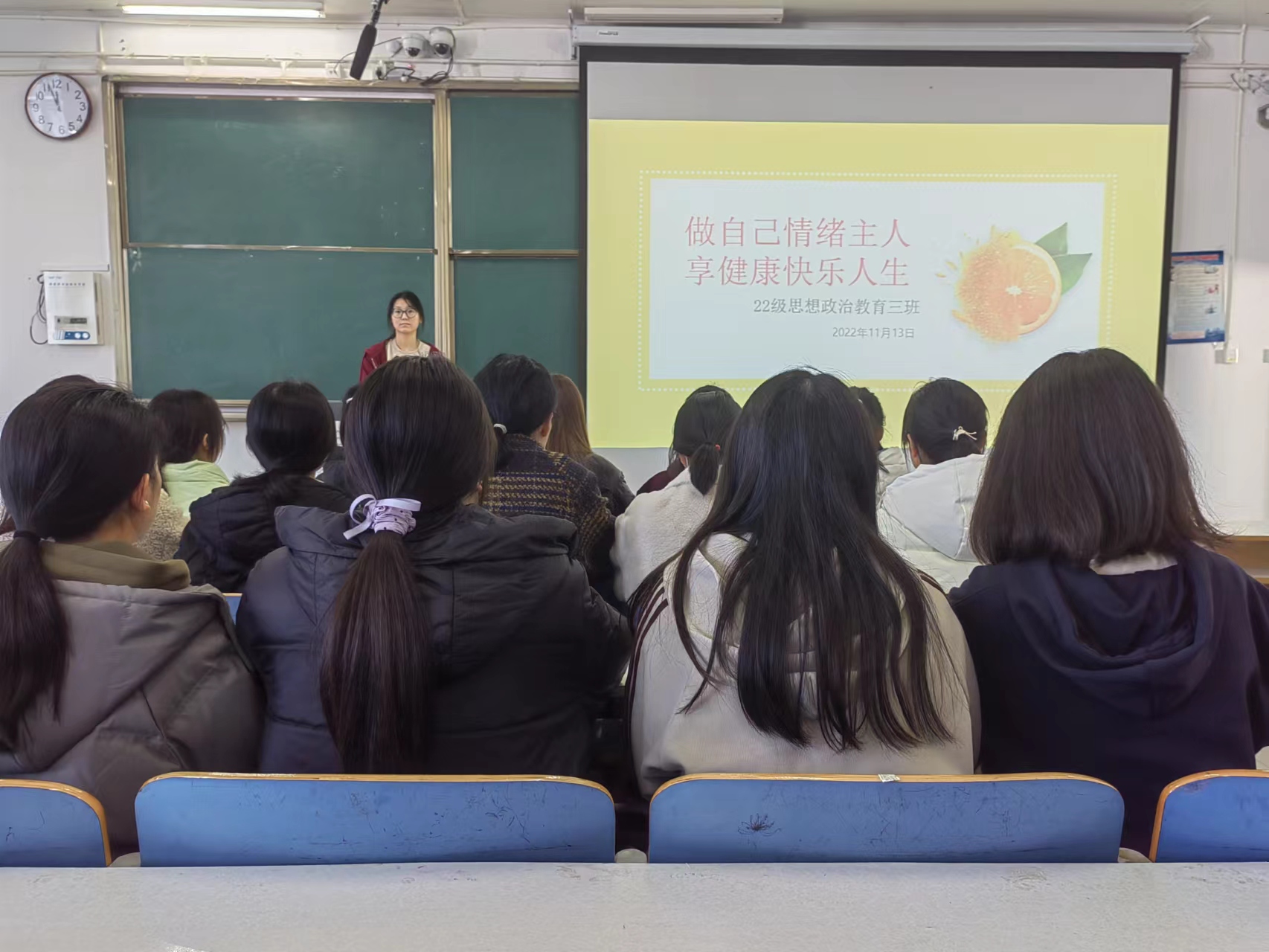 为进一步提高大学生心理素质,促进身心健康,11月13日上午,永利集团官网2022级思想政治教育三班在社科楼514教室召开“做自己情绪主人,享健康快乐人生”主题班会。永利集团官网2022级思想政治教育三班全体成员共同参加班会,班会由心理委员张韶涵主持。