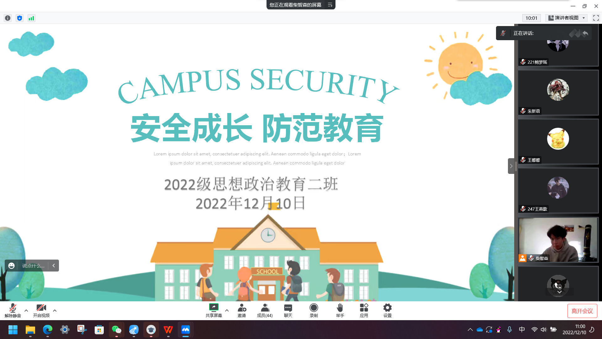 为切实加强安全教育,提高学生假期安全防范意识和自我防护意识,12月10日上午,永利集团官网2022级思想政治教育二班于线上召开“安全成长 防范教育”主题班会。2022级思想政治教育二班全体同学共同参加会议。本次会议由副班长柴智森主持。