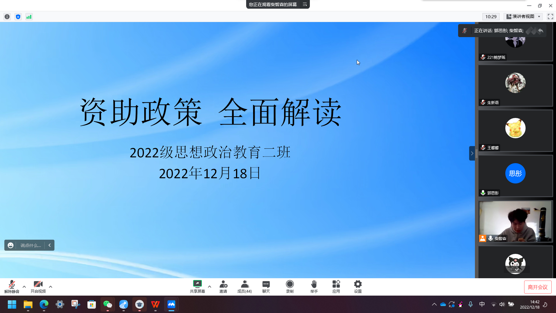为使学生进一步了解和明确国家教育资助政策,提升资助育人质量,12月18日下午,永利集团官网2022级思想政治教育二班于线上召开“资助政策 全面解读”主题班会。2022级思想政治教育二班全体同学共同参加会议。班会由副班长柴智森主持。