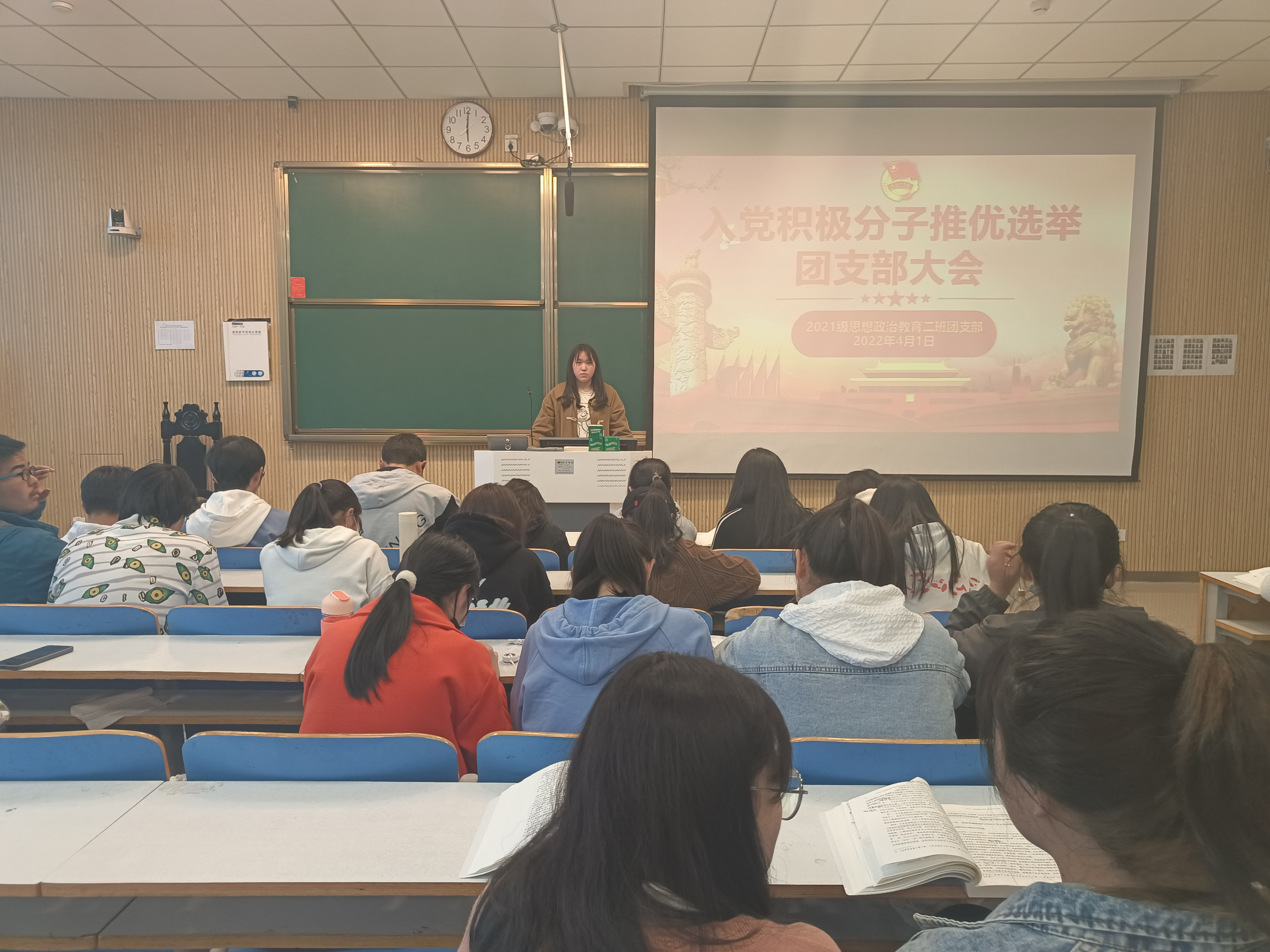 4月1日下午,永利集团官网2021级思想政治教育二班在社科楼515教室召开入党积极分子推优选举团支部大会。2021级思想政治教育二班全体团员参与此次团支部大会,团支部大会由团支书王婧欣主持。