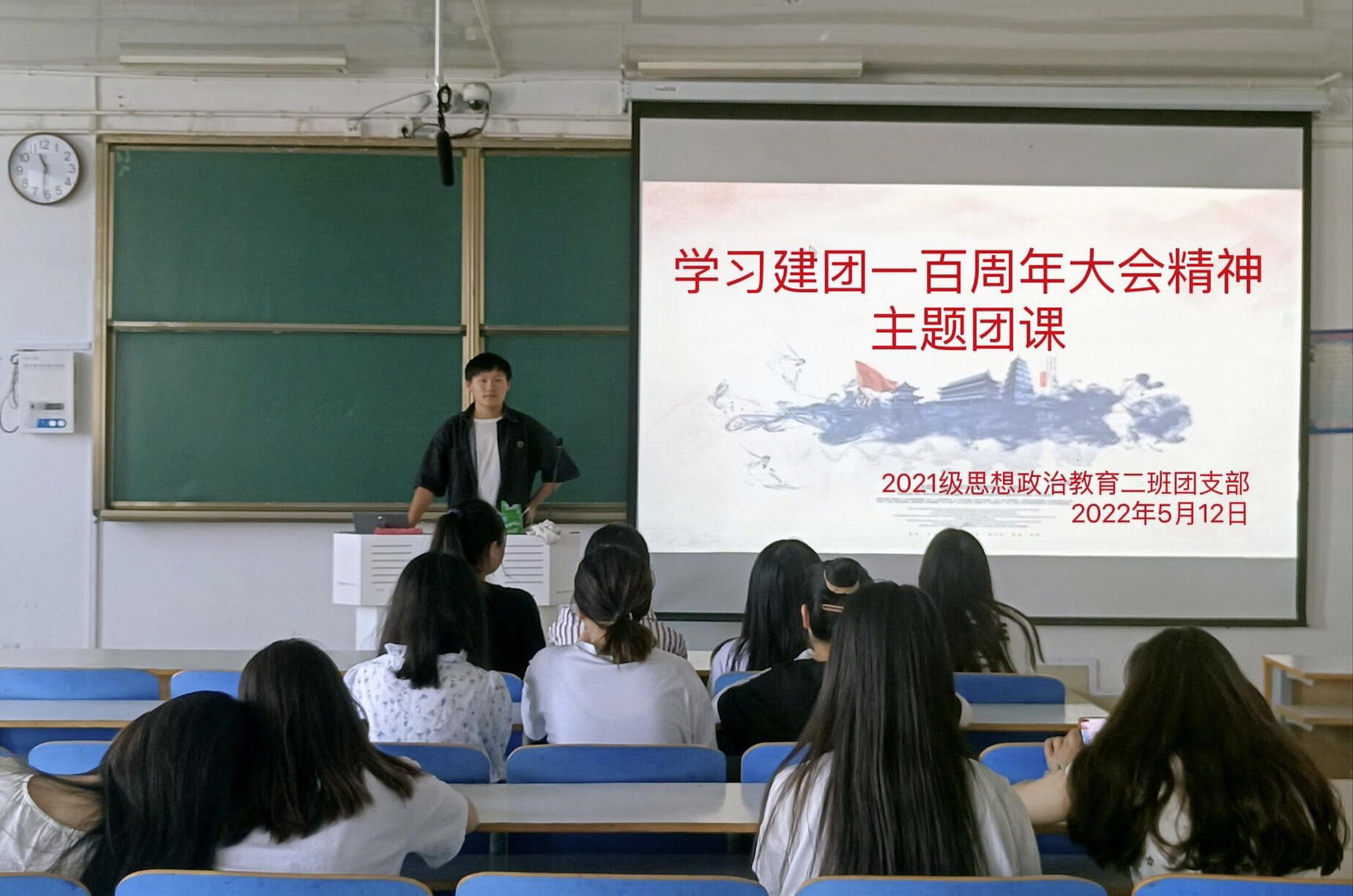 5月12日,永利集团官网2021级思想政治教育二班在社科楼514教室召开学习建团一百周年大会精神主题团课。2021级思想政治教育二班全体团员参加此次团课。团课由团支书王婧欣主持。