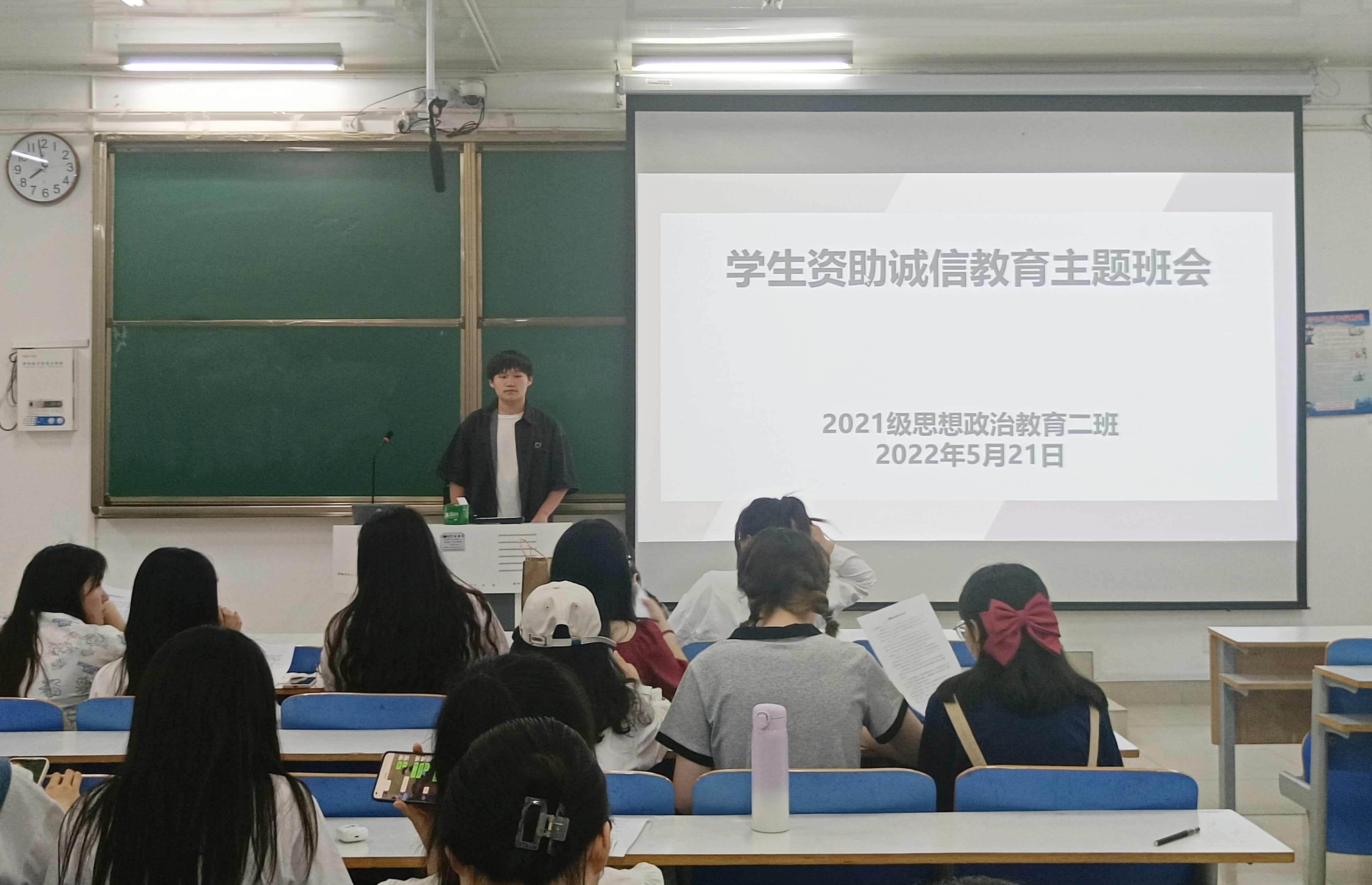 5月21日下午,永利集团官网2021级思想政治教育二班在社科楼514教室召开“学生资助诚信教育”主题班会。2021级思想政治教育二班全体同学参加此次班会。班会由副班长任振豪主持。
