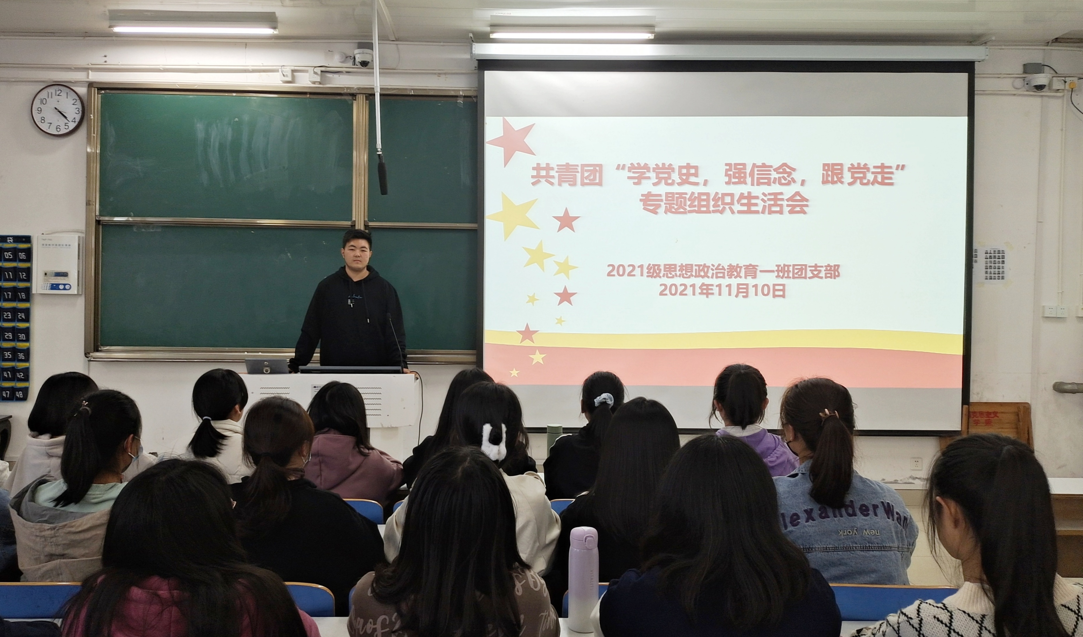 响应共青团“学党史、强信念、跟党走”的号召,11月10日下午,永利集团官网2021级思想政治教育一班在社科楼516教室召开组织生活会。2021级思想政治教育一班全体成员参加了本次大会。会议由团支书戴翰林主持。