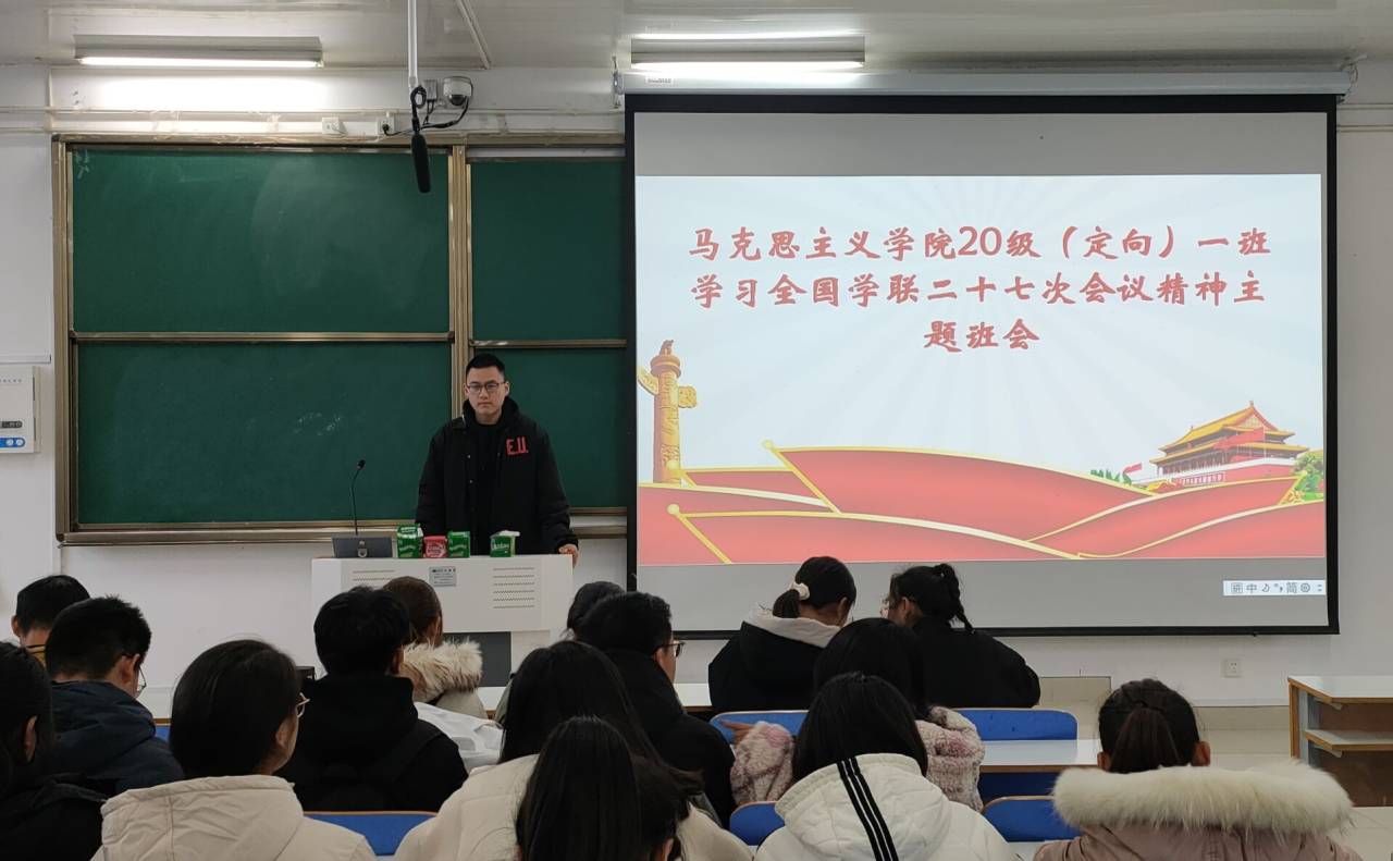11月24日上午,永利集团官网定向一班在社科楼514教室顺利举办“深入学习全国学联第二十七次大会精神”主题班会。全体学生聆听了此次班会,班会由团支书朱紫峰主持。
