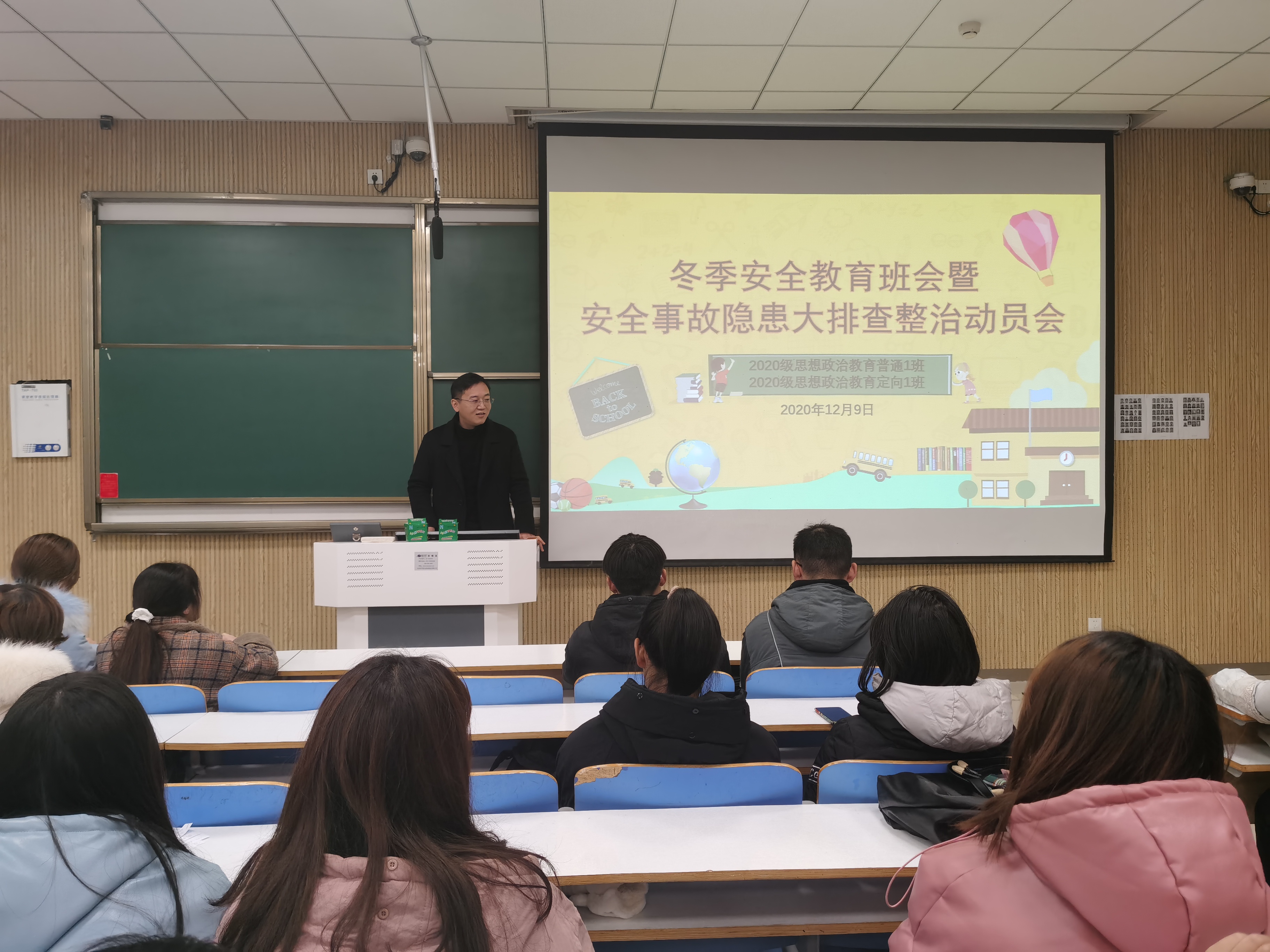 为提高同学们的安全防范意识,12月9日下午,2020级思想政治教育一班、定向一班在社科楼515教室开展“冬季安全教育班会暨安全事故隐患大排查整治动员会”,2020级思想政治教育一班、定向一班全体成员参加了本次班会,班会由辅导员曹栋主持。