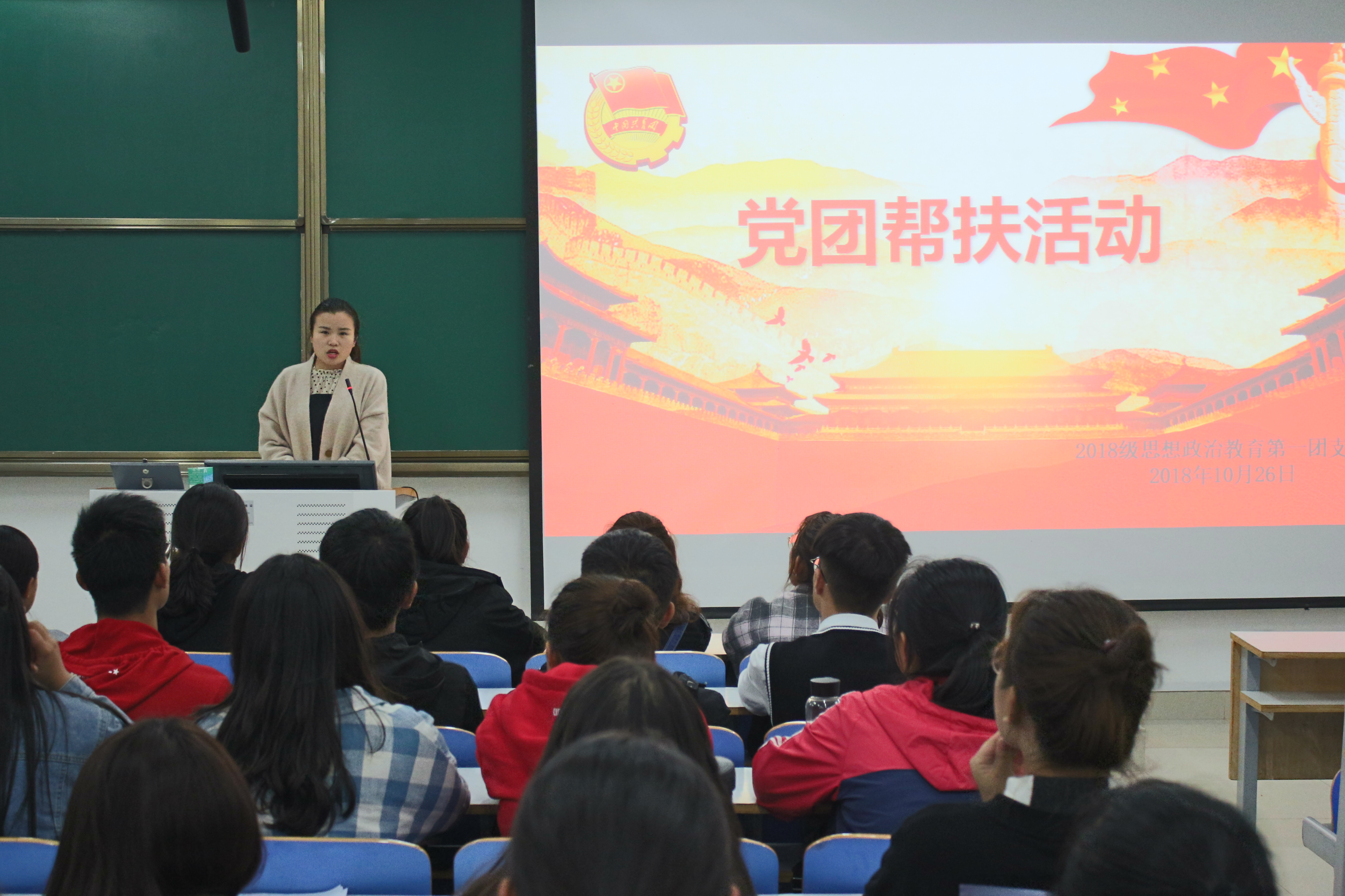 为充分发挥党员干部的先锋模范作用,促进学生全面健康发展。10月26日晚,永利集团官网2018级思想政治教育一班在社科楼514教室顺利开展“党团帮扶”班会。2018级思政一班全体同学参加此次班会。班会由团支书靳雨露主持。