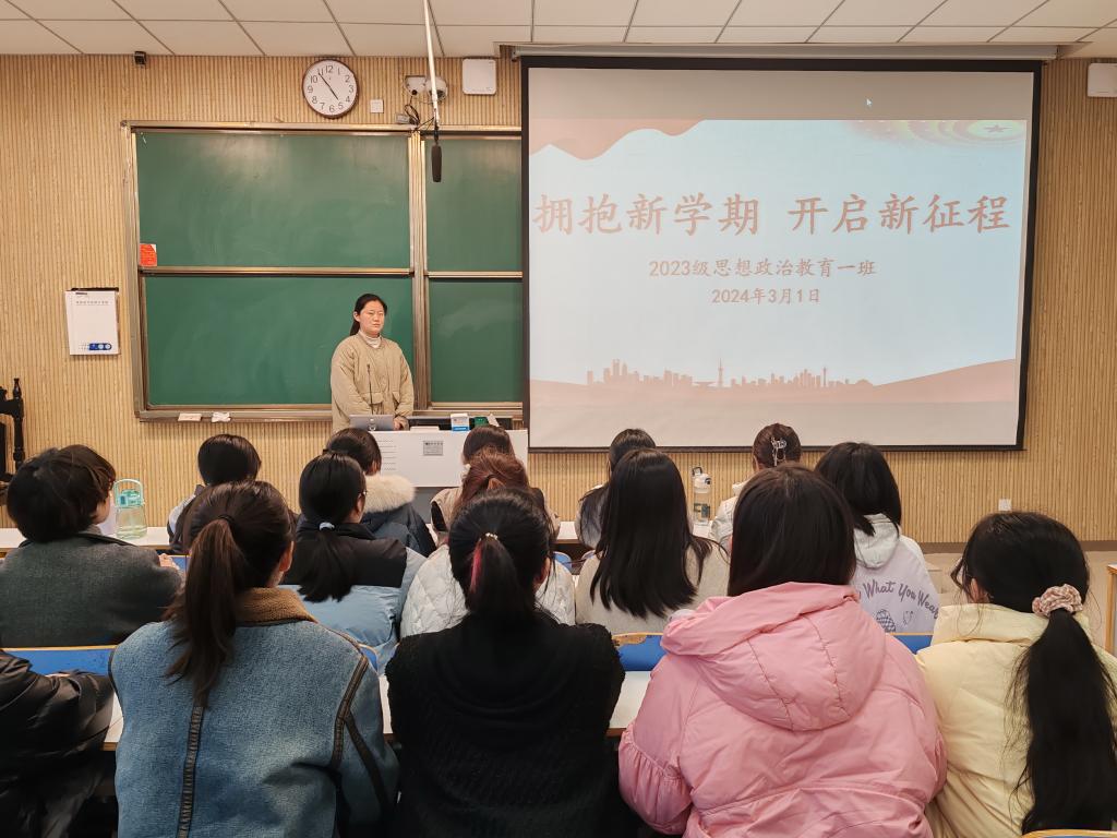 为更好地迎接新学期的到来,顺利开展各项工作,3月1日上午,永利集团官网2023级思想政治教育一班在社科楼515教室召开“拥抱新学期,开启新征程”主题班会。永利集团官网2023级思想政治教育一班全体同学共同参与本次班会,班会由团支书张卓主持。