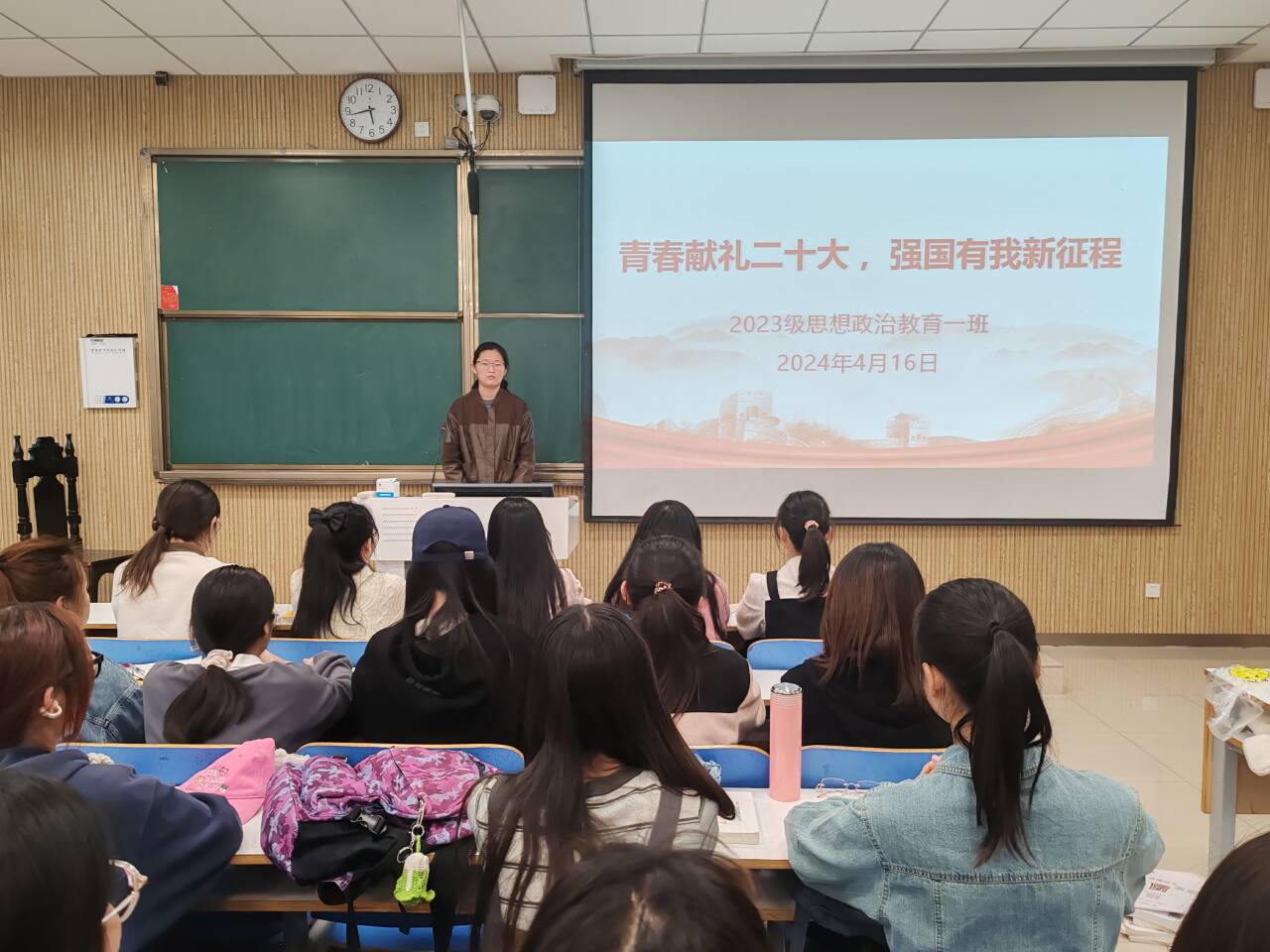 为引导我班学子坚定理想信念,厚植爱党爱国情怀,自觉践行社会主义核心价值观,4月16日上午,永利集团官网2023级思想政治教育一班在社科楼515教室召开“青春献礼二十大,强国有我新征程”主题团课。永利集团官网2023级思想政治教育一班全体同学共同参与本次团课,团课由团支书张卓主持。