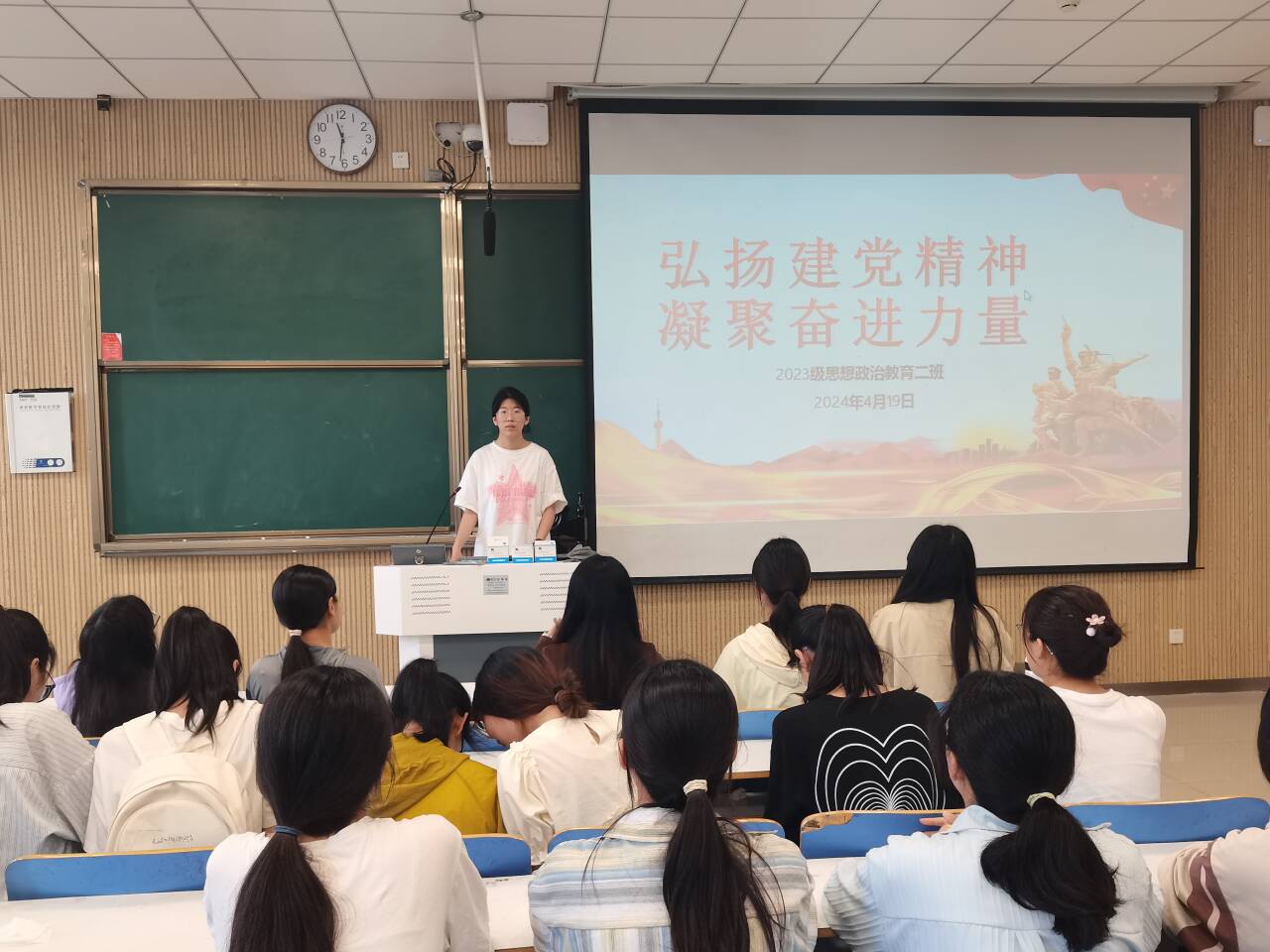 为弘扬伟大建党精神,确保广大青年大学生始终坚持听党话、跟党走,4月16日下午,永利集团官网2023级思想政治教育二班在社科楼515教室召开“弘扬建党精神,凝聚奋进力量”主题团课。本次主题团课由团支书王慜初主持,全体二班同学参加。