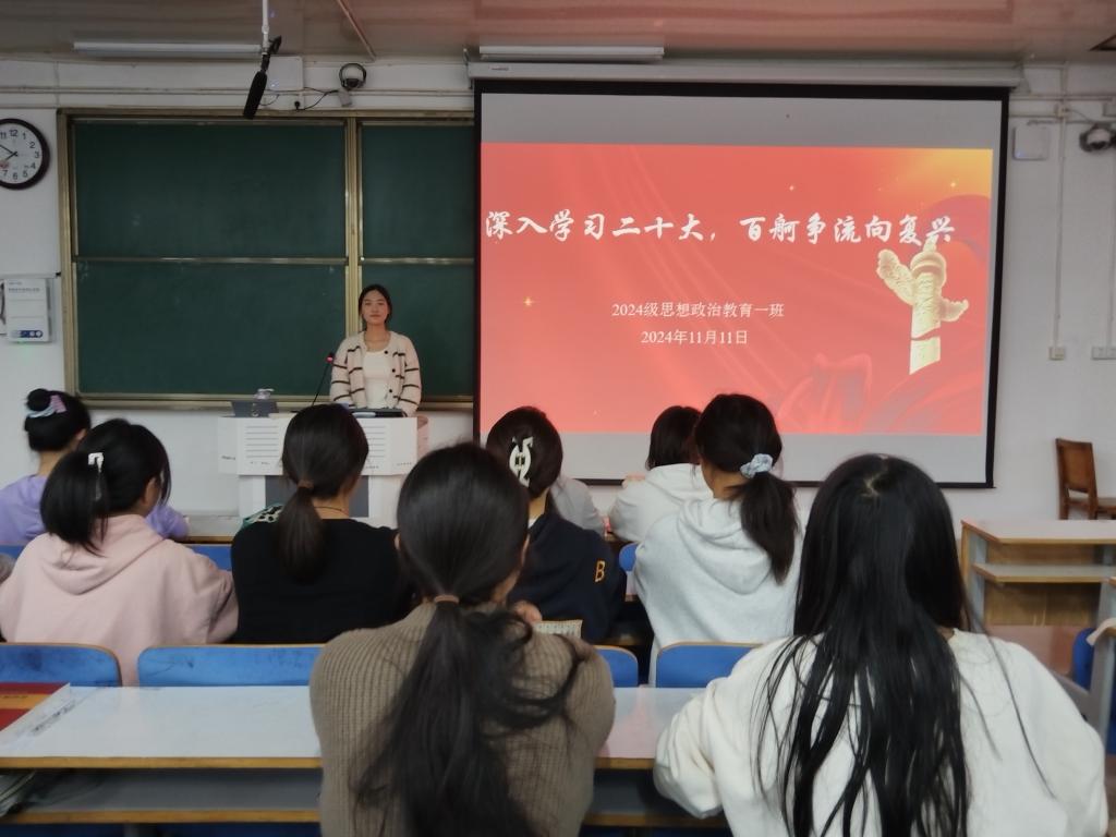 为深入学习贯彻党的二十大精神,培养我班同学的政治意识、大局意识、核心意识、看齐意识,增强同学们的责任担当和奋斗热情。11月11日上午,2024级思想政治教育一班在社科楼515教室开展“深入学习二十大,百舸争流向复兴”主题团课,本次团课由团支书李冉主持,一班全体同学参加。