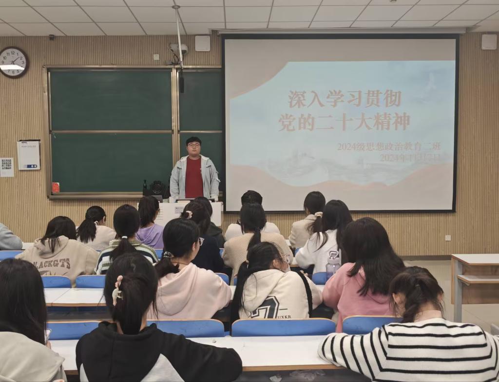 为让青年深刻领会党的二十大精神实质和丰富内涵,增强对党的路线方针政策的理解和认同,提高政治觉悟和政治能力,11月7日下午,永利集团官网 2024 级思想政治教育二班于社科楼515教室举办了 “深入学习贯彻党的二十大精神”主题团课活动。此次团课由团支书王志颖主持,二班全体同学共同参与。