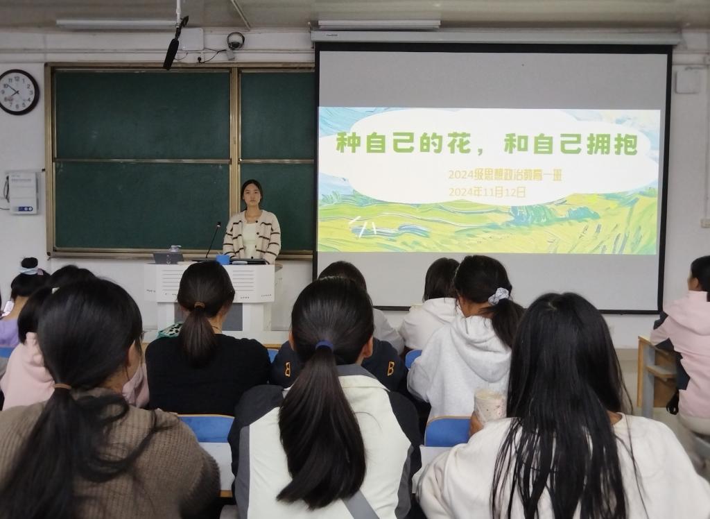 为引导我班学生主动关注自身情绪,培养积极向上的心态和自我关爱意识,11月12日上午,2024级思想政治教育一班在社科楼515教室开展“种自己的花,和自己拥抱”主题班会,本次班会由班长李冉主持,一班全体同学参加。