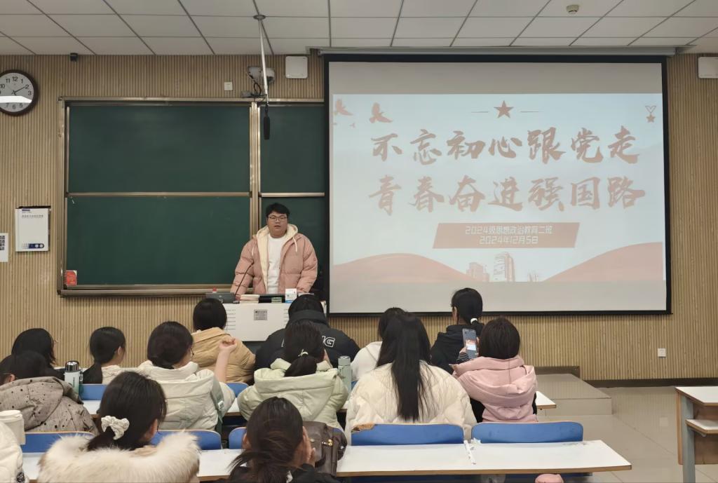 为引导青年学生牢记初心使命,坚定理想信念,以实际行动践行党的领导和时代担当,12月5日下午,永利集团官网2024级思想政治教育二班在社科楼515教室举办了“不忘初心跟党走,青春奋进强国路”主题团课。此次团课由团支书王志颖主持,二班全体同学共同参与。