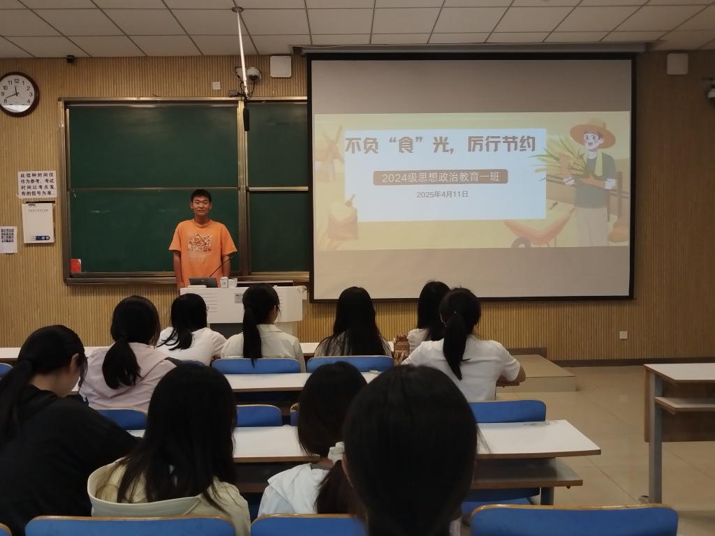 为弘扬勤俭节约的传统美德,培养我班学生珍惜粮食的良好习惯,4月11日上午,永利集团官网2024级思想政治教育一班于社科楼514教室开展“不负‘食’光,厉行节俭”主题班会。本次班会由副班长马奔主持,一班全体同学参加。