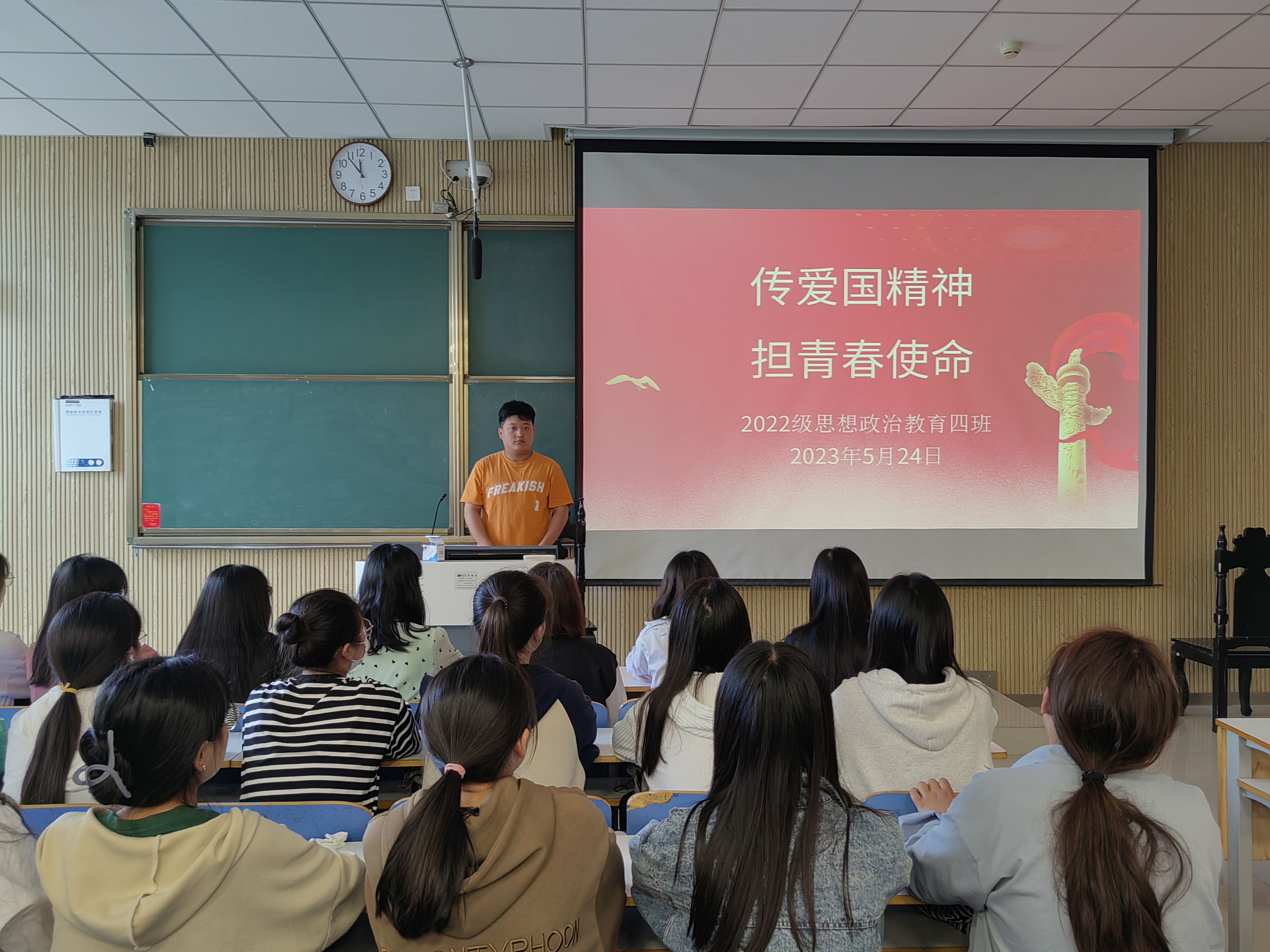 为加强爱国主义教育,培养同学们的爱国主义情怀, 5月24日上午,永利集团官网2022级思想政治教育四班在社科楼515教室召开“传爱国精神,担青春使命”主题班会,永利集团官网2022级思想政治教育四班全体同学参加本次班会。会议由副班长宋奕铭主持。
