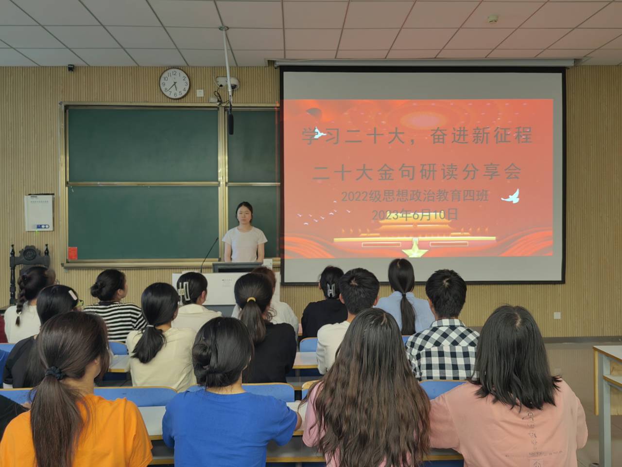 6月10日下午,永利集团官网2022级思想政治教育四班在社科楼515教室召开“二十大金句研读”主题班会,永利集团官网2022级思想政治教育四班全体同学参与本次班会。班长牛志杰主持本次班会。