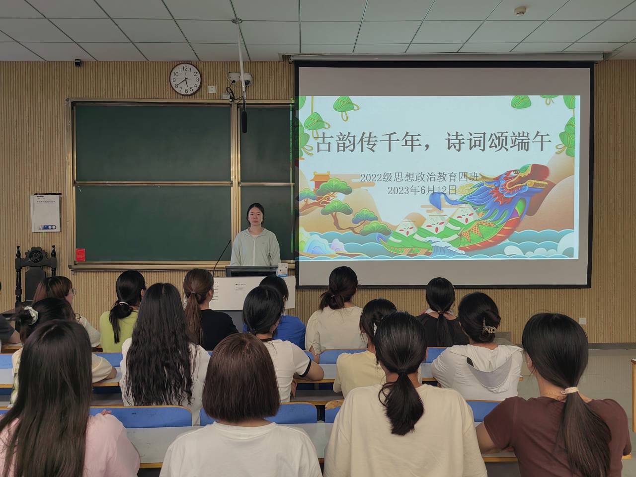 为帮助同学们进一步了解端午节习俗,弘扬中华文化,6月12日下午,永利集团官网2022级思想政治教育四班在社科楼515教室召开“古韵传千年,诗词颂端午”主题班会,永利集团官网2022级思想政治教育四班全体同学参与本次班会。班长牛志杰主持本次班会。