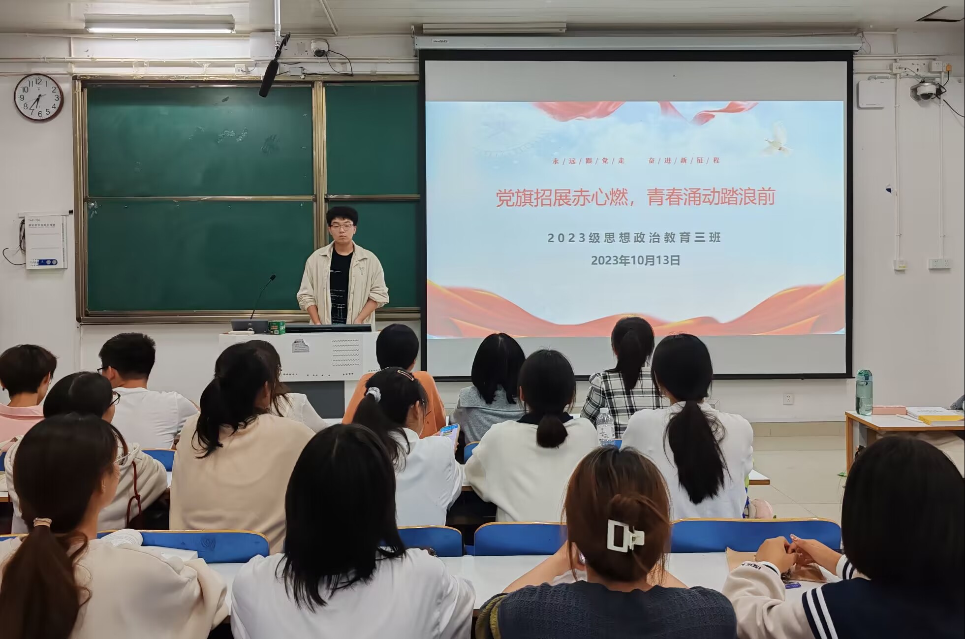 10月13日上午,永利集团官网2023级思想政治教育三班在社科楼515教室召开“党旗招展赤心燃,青春涌动踏浪前”主题团课。永利集团官网2023级思想政治教育三班全体成员共同参加此次团课,团课由团支书郝瀚主持。