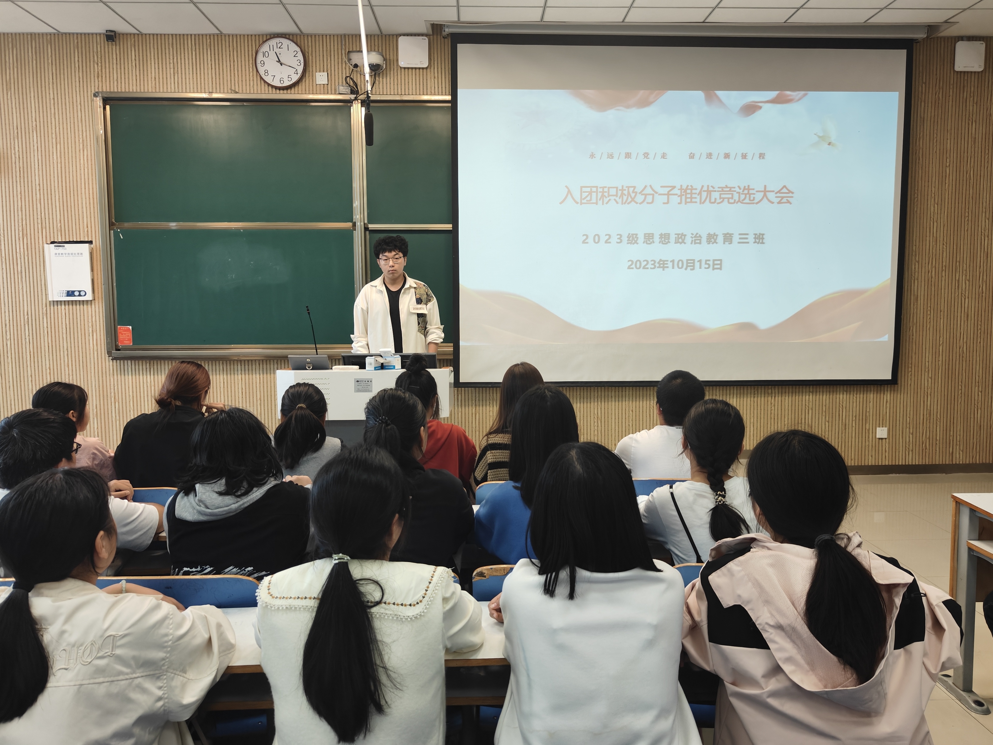 为加强团的组织建设,激励广大青年奋进新征程,10月15日下午,永利集团官网2023级思想政治教育三班在社科楼515教室举行团员积极分子推选班会。永利集团官网2023级思想政治教育三班全体成员共同参加此次班会,班会由团支书郝瀚主持。