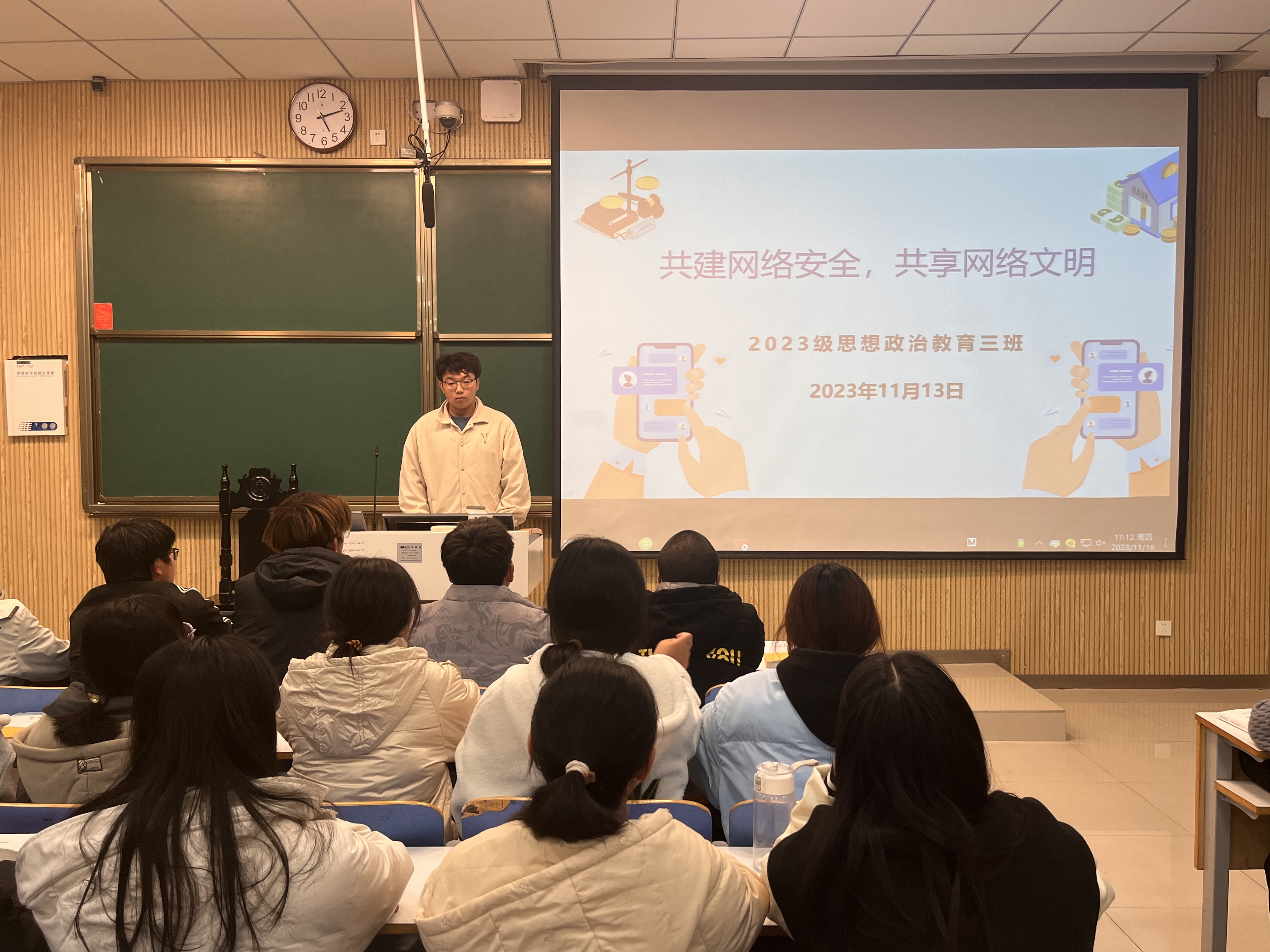 为宣传网络安全知识,避免不法言论对青年学子的误导,11月13日上午,永利集团官网2023级思想政治教育三班在社科楼515教室召开“共建网络安全,共享网络文明”主题团课。永利集团官网2023级思想政治教育三班全体成员共同参加此次团课,团课由团支书郝瀚主持。