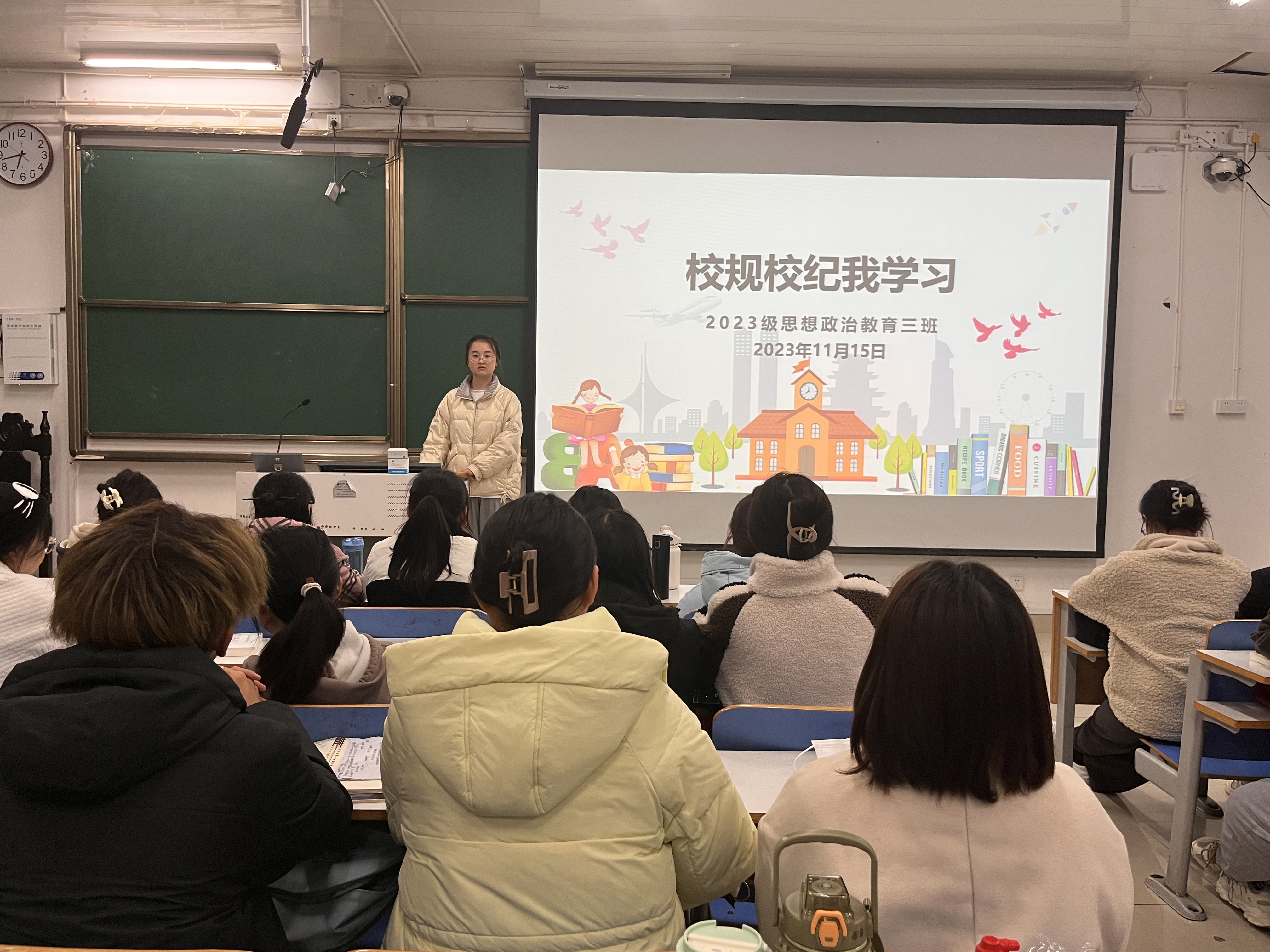 为更好让同学们了解学校校规校纪,11月15日上午,永利集团官网2023级思想政治教育三班在社科楼514教室召开“校规校纪我学习”主题团课。永利集团官网2023级思想政治教育全体成员共同参加此次团课,团课由副班长李佩宣主持。