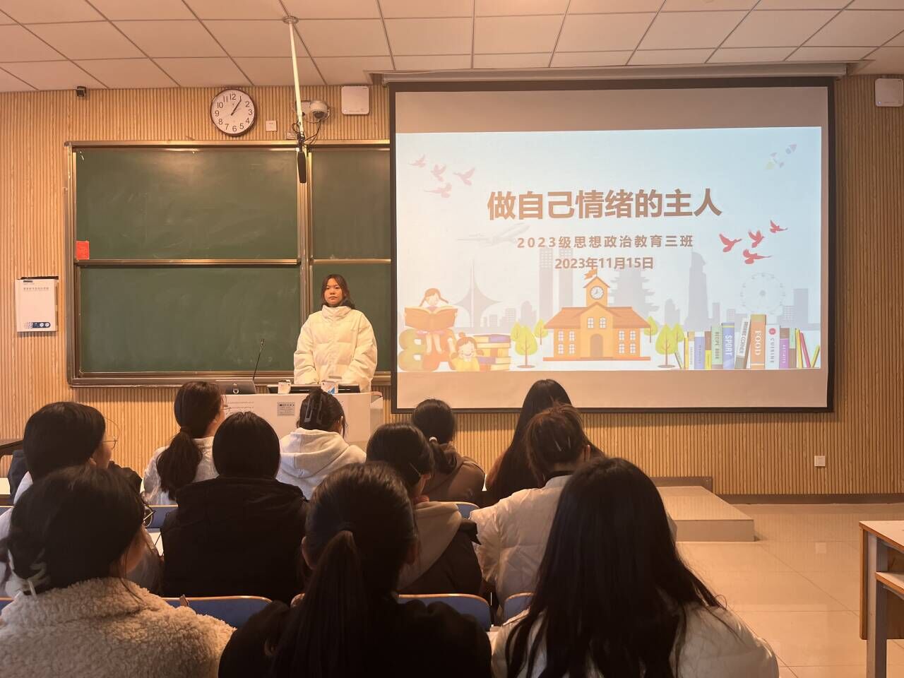 为引导学生关注心理健康问题,11月15日上午,永利集团官网2023级思想政治教育三班在社科楼515教室召开“做自己情绪的主人”心理班会。永利集团官网2023级思想政治教育三班全体成员共同参加此次班会,班会由心理委员安雅楠主持。