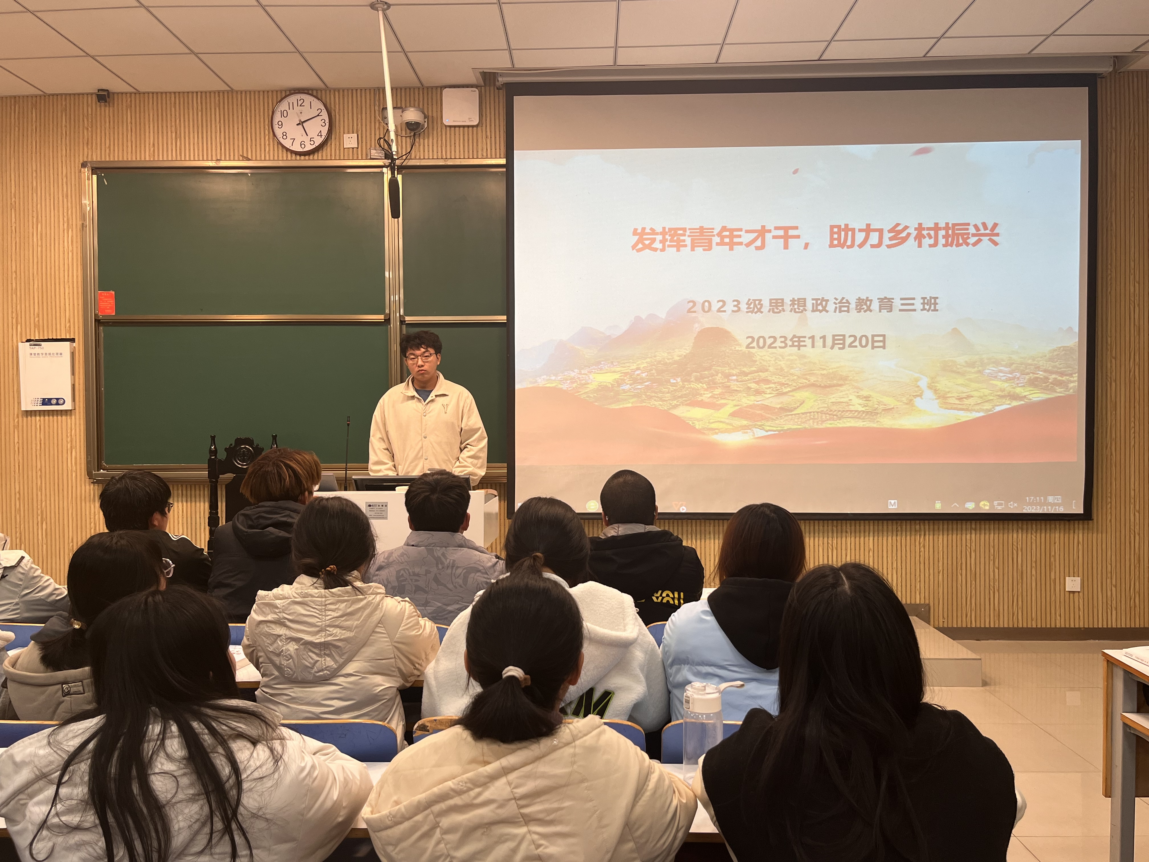 为推动建设美丽中国,发挥青年才干,11月20日上午,永利集团官网2023级思想政治教育三班在社科楼515教室召开“发挥青年才干,助力乡村振兴”主题团课。永利集团官网2023级思想政治教育三班全体成员共同参加此次团课,团课由团支书郝瀚主持。