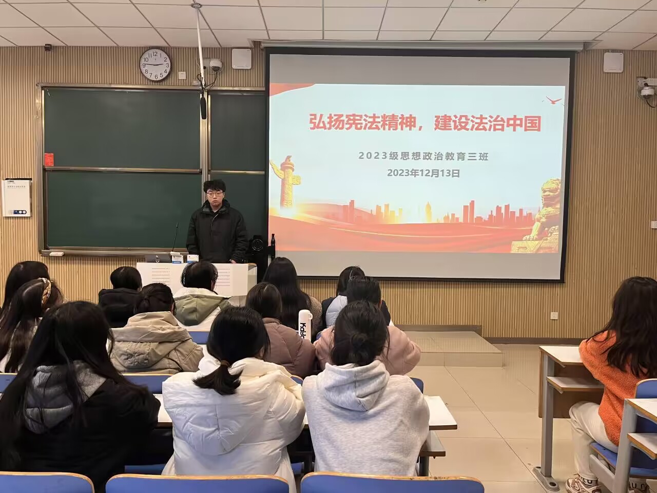 为弘扬宪法精神,维护宪法权威,12月13日上午,永利集团官网2023级思想政治教育三班在社科楼515教室召开“弘扬宪法精神,建设法治中国”主题团课。永利集团官网2023级思想政治教育三班全体成员共同参加此次团课,团课由团支书郝瀚主持。