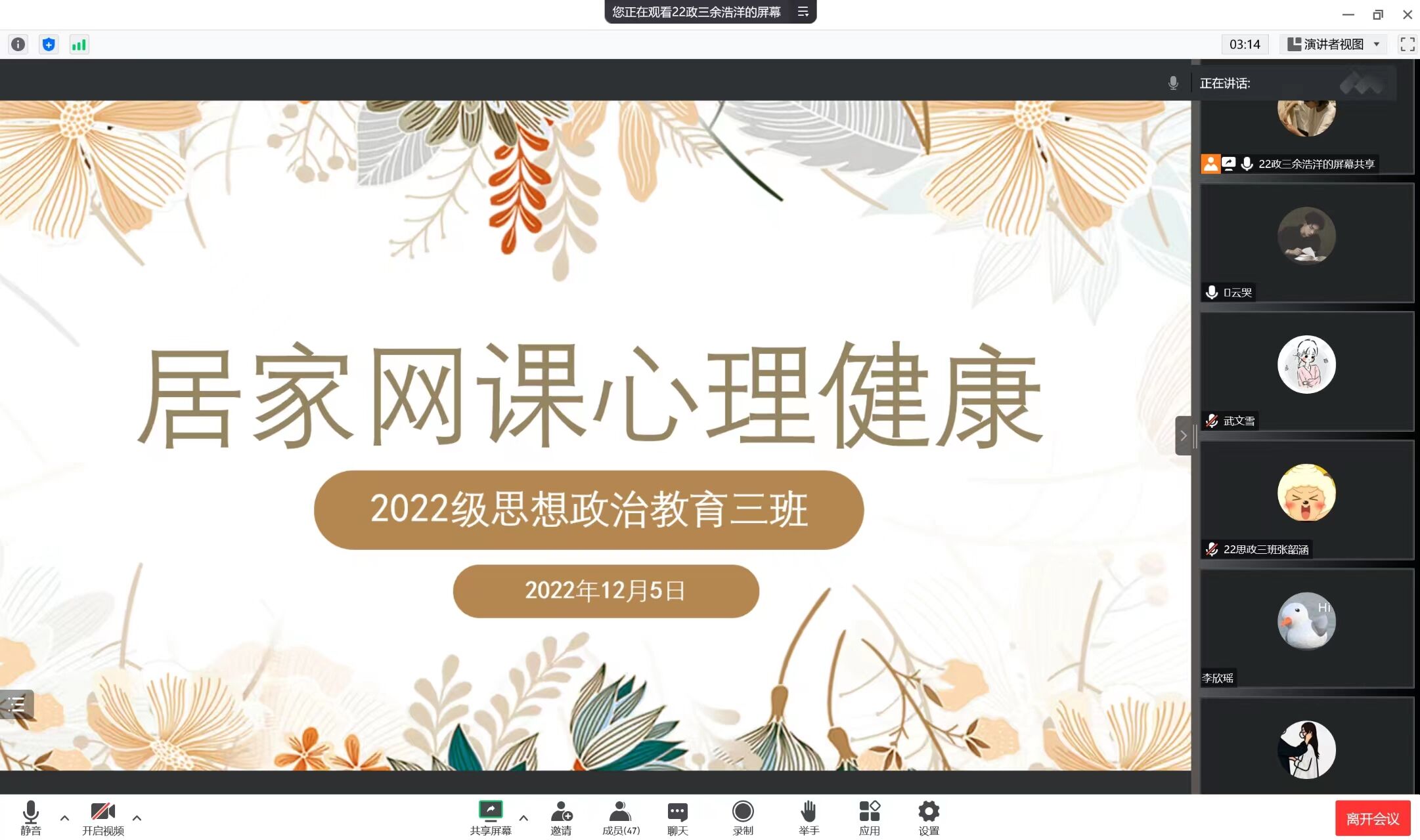 为缓解学习压力,激发拼搏动力,12月5日上午,永利集团官网2022级思想政治教育三班在线上召开居家网课心理健康主题班会。永利集团官网2022级思想政治教育三班全体成员共同参与此次班会,班会由心理委员张韶涵主持。