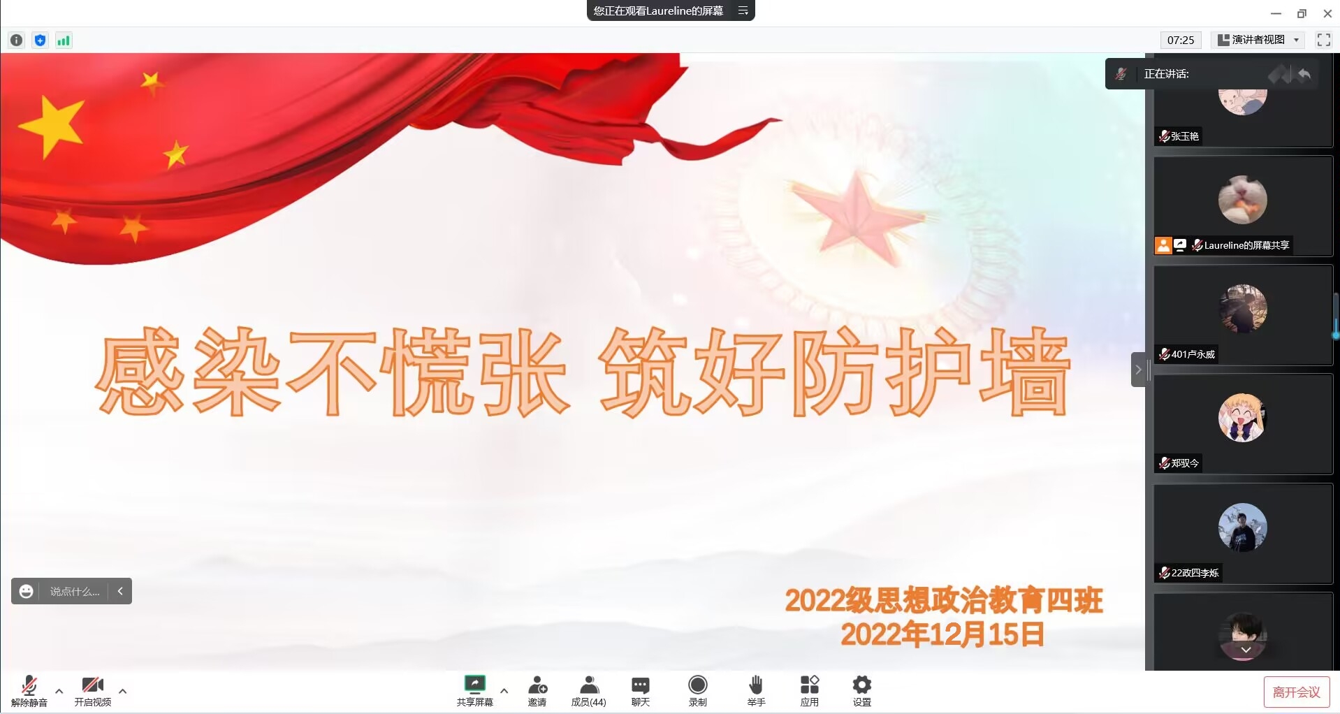 为宣传新形势下的防护政策,缓解同学们的不安情绪,12月15日下午,永利集团官网2022级思想政治教育四班在线上召开“感染不慌张,筑好防护墙”主题班会,2022级思想政治教育四班全体同学参与本次班会。会议由班长牛志杰主持。
