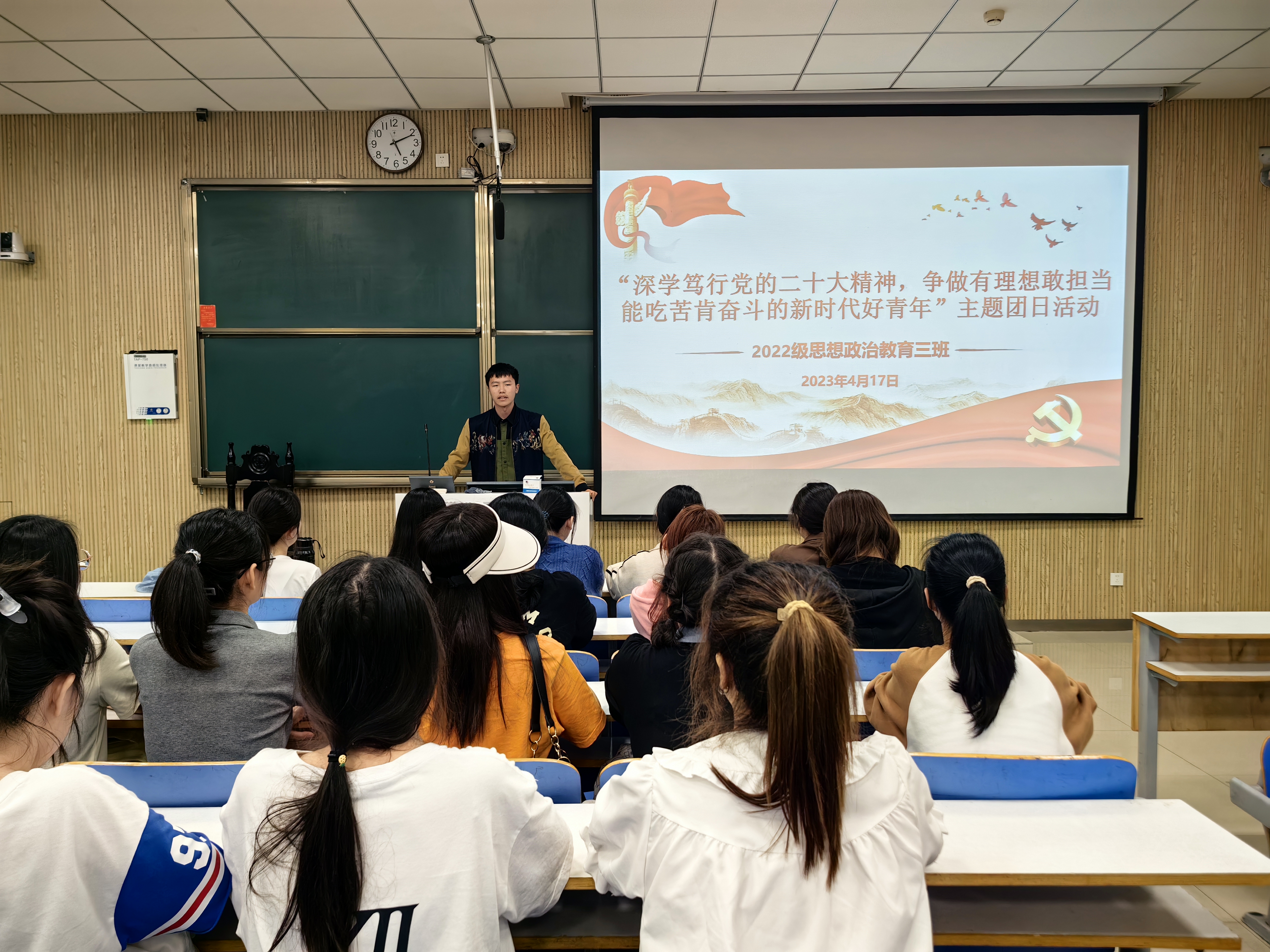 本次团课围绕研读二十大、感悟深刻内涵和争做时代青年三个方面展开。团课伊始,余浩洋强调,中国共产党第二十次全国代表大会,是在全党全国各族人民迈上全面建设社会主义现代化国家新征程、向第二个百年奋斗目标进军的关键时刻召开的一次十分重要的大会。接着,学生代表周子妍发言,“二十大”报告高屋建瓴、思想深邃、内容丰富,高举中国特色社会主义伟大旗帜,为人民幸福、社会和谐、国家富强提供了根本遵循。最后,余浩洋要求,在新时代新征程路上,新青年一要有理想,坚定理想信念,坚定不移听党话、跟党走;二要敢担当,怀抱梦想又脚踏实地,做实事、有作为;三要能吃苦,树牢拼搏奋进的信念,在全面建设社会主义现代化国家的火热实践中顽强奋斗。