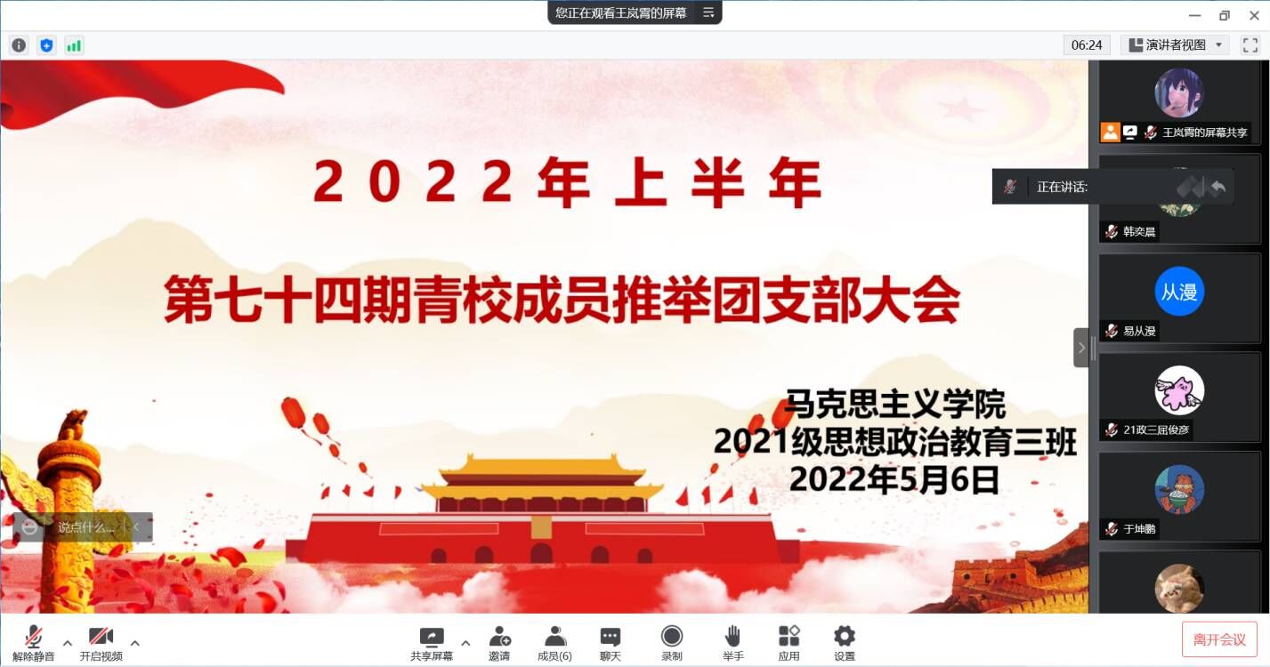 5月6日上午,永利集团官网2021级思想政治教育三班召开线上第七十四期青校成员推举团支部大会。永利集团官网2021级思想政治教育三班全体团员参与此次会议。会议由团支书王岚霄主持,秦梦莹担任监票员,陈笑宇担任记录员。