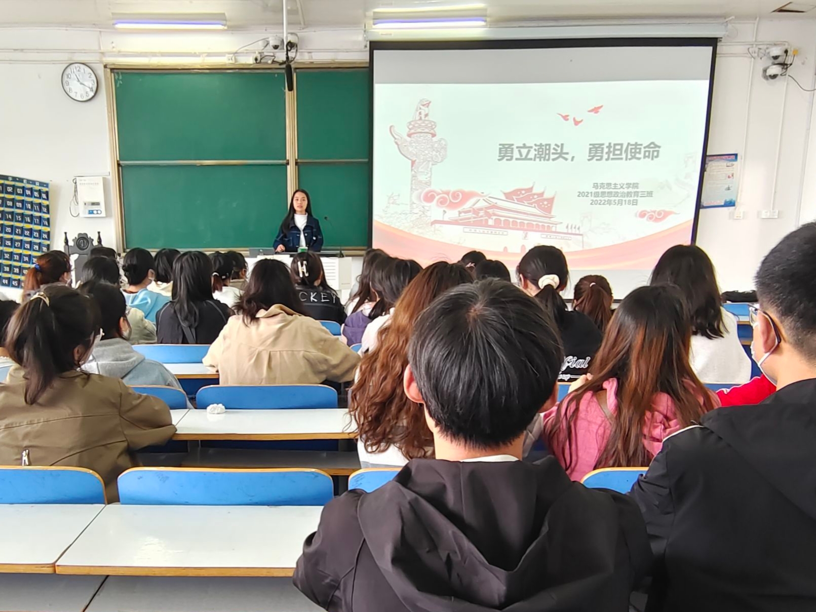 5月18日上午,永利集团官网2021级思想政治教育三班在社科楼514教室召开“勇立潮头,勇担使命”主题团课。2021级思想政治教育三班全体成员参与此次团课。团课由团支书王岚霄主持。