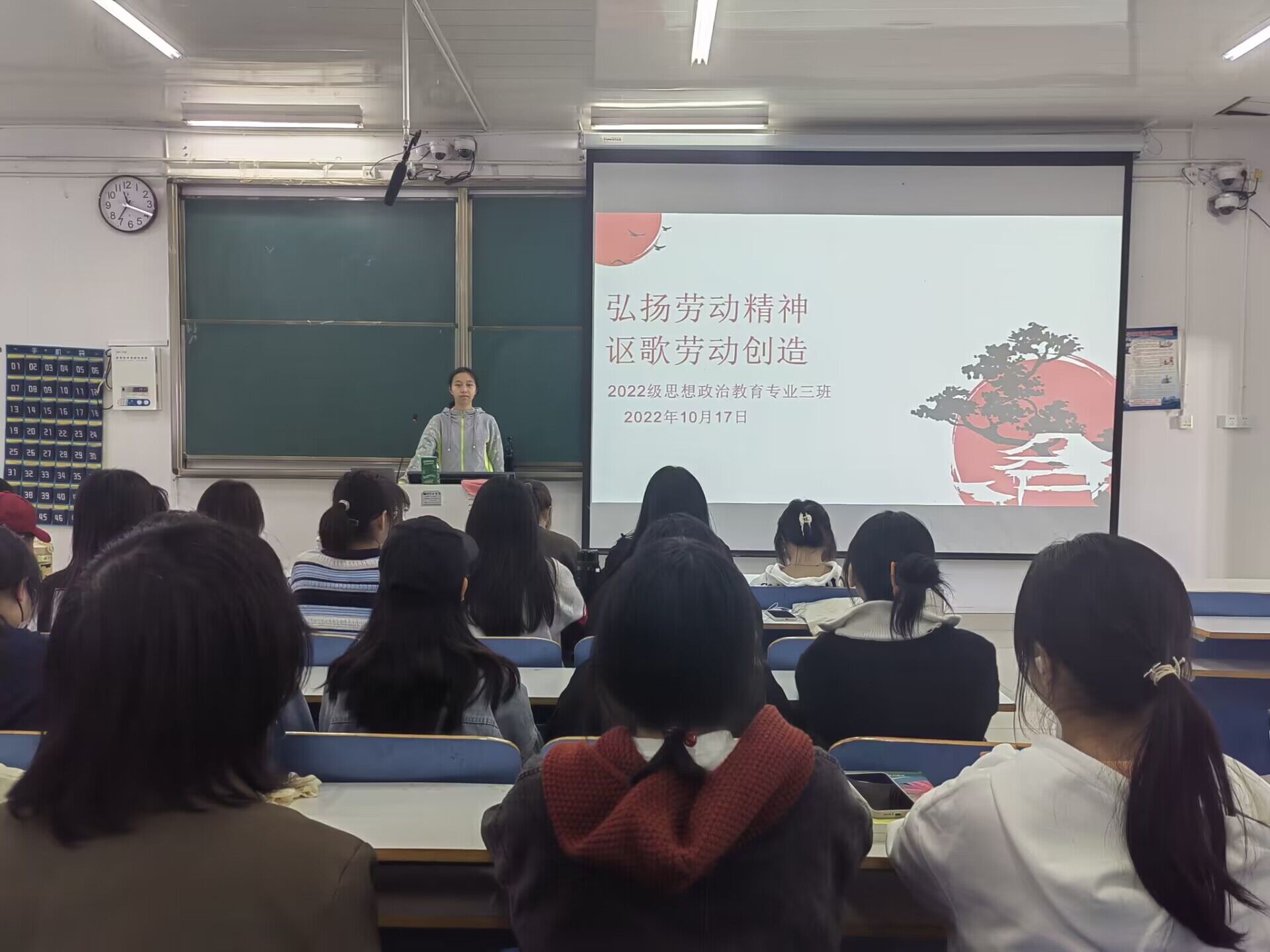 为树立正确的劳动观,切实加强大学生劳动教育,10月17日上午,永利集团官网2022级思想政治教育三班在社科楼515教室召开“弘扬劳动精神,讴歌劳动创造”主题班会。2022级思想政治教育三班全体成员参加会议,会议由劳动委员郑慧芳主持。